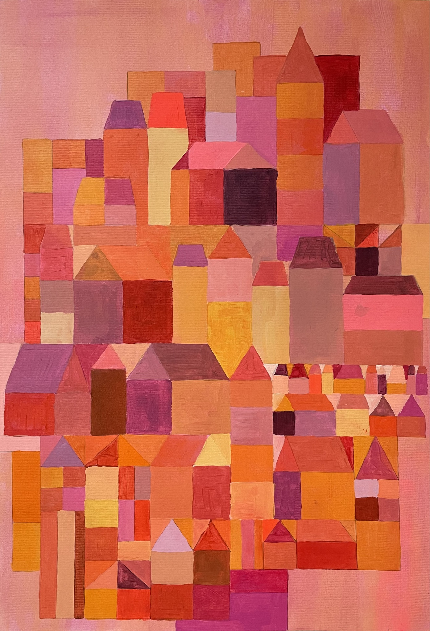 In dit werk verbeeldt de kunstenaar huisjes in een figuratieve vorm, kriskras door elkaar geplaatst. Gaandeweg in het maakproces begon de vaste vorm te vervagen — de herkenbare contouren van het huis werden steeds losser, vrijer, abstracter. Zo ontstond de titel De vorm loslaten: een verwijzing naar zowel het beeldende proces als het innerlijke proces waarin de kunstenaar zich bevindt. Het werk wordt zo een metafoor voor het durven loslaten van structuren en het openstaan voor nieuwe betekenissen. 'De vorm loslaten’ brengt rust, ruimte en verbeelding in elke interieurstijl. De zachte abstractie en symboliek van vrijheid maken dit werk tot een tijdloze blikvanger die blijft raken.