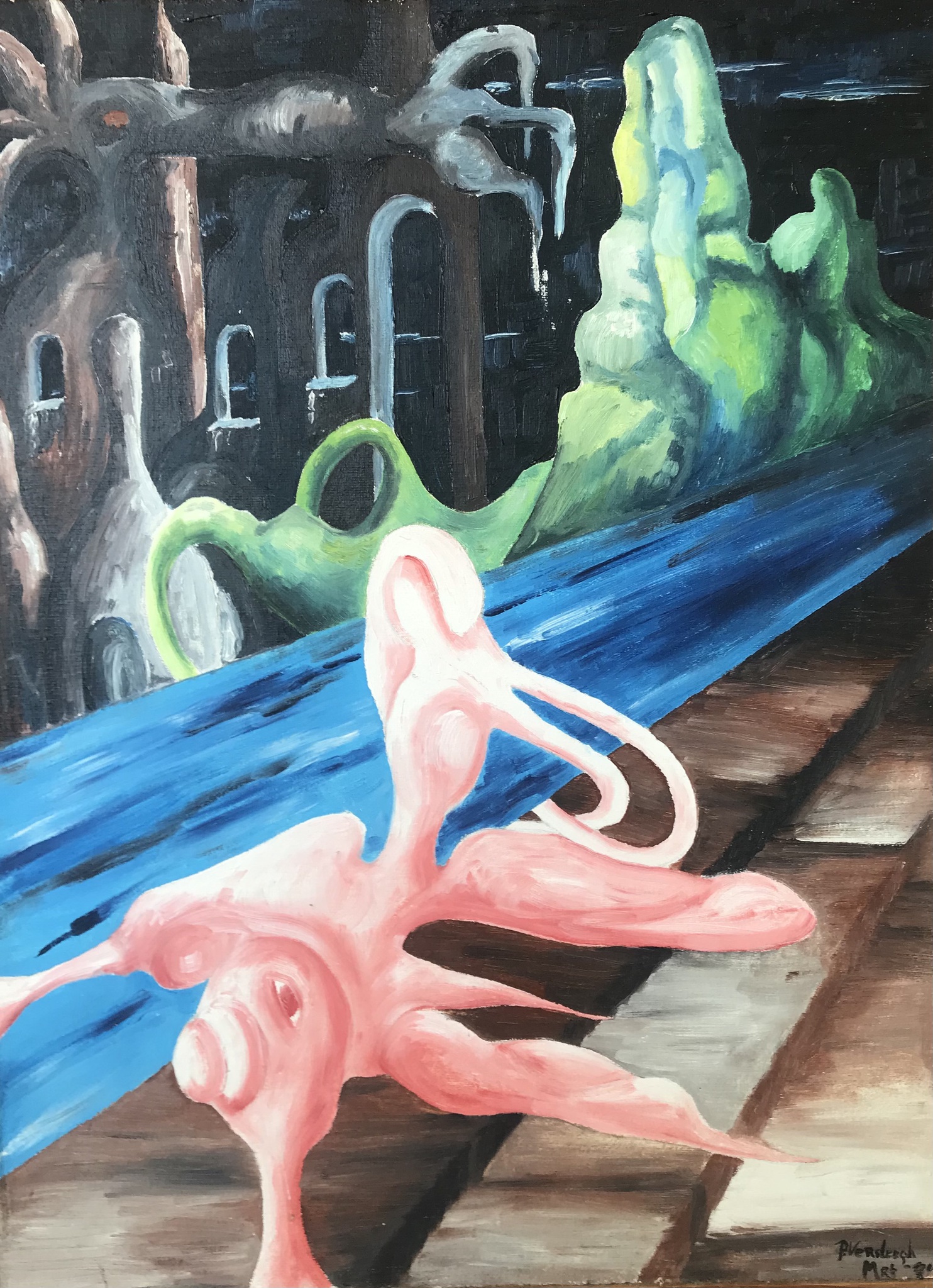 Ten tijde van de K.A.B.K. identificeerde ik me met de uitgangspunten van het surrealisme: het zuiver psychisch automatisme ,waarmee wij het werkelijk denkproces in het schilderen willen weergeven. Het geloof hierin is gebaseerd op een hogere realiteit van bv . de almacht van de droom - bepaalde associatievormen- en het belangeloos gedachtespel. Het belangeloos gedachtespel gaf mij ruimte om zonder veel nadruk op techniek mijn schilderijen vorm te geven.