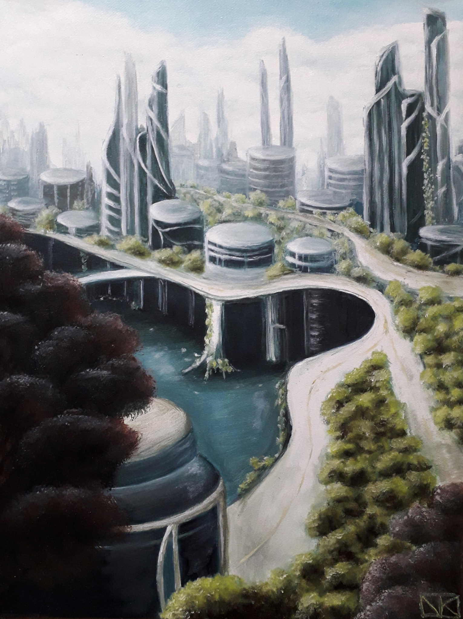 Schilderij Olieverf Landschap Futuristisch Stad