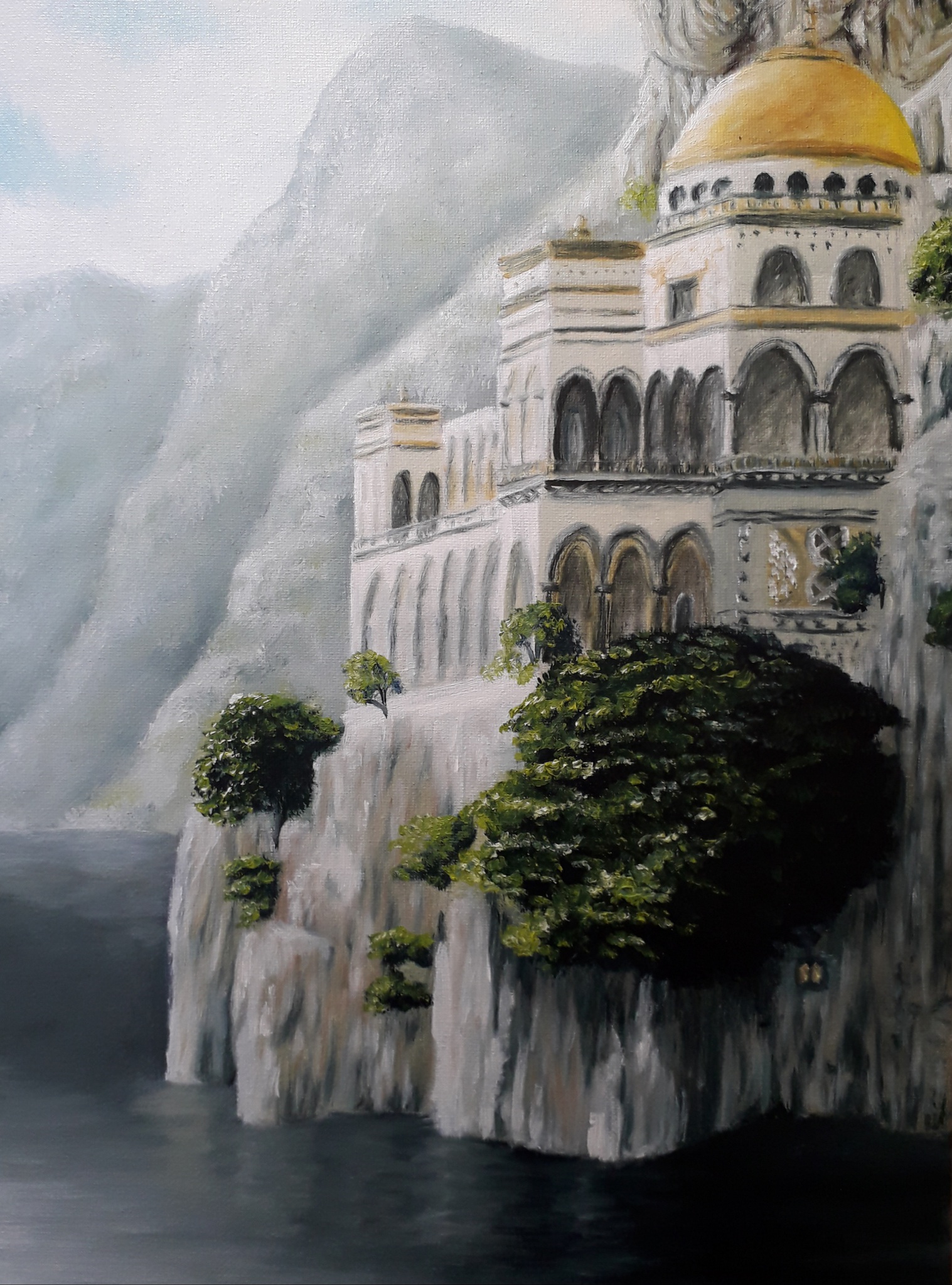 Schilderij Olieverf Landschap Bergen Kerk Geloof Moskee
