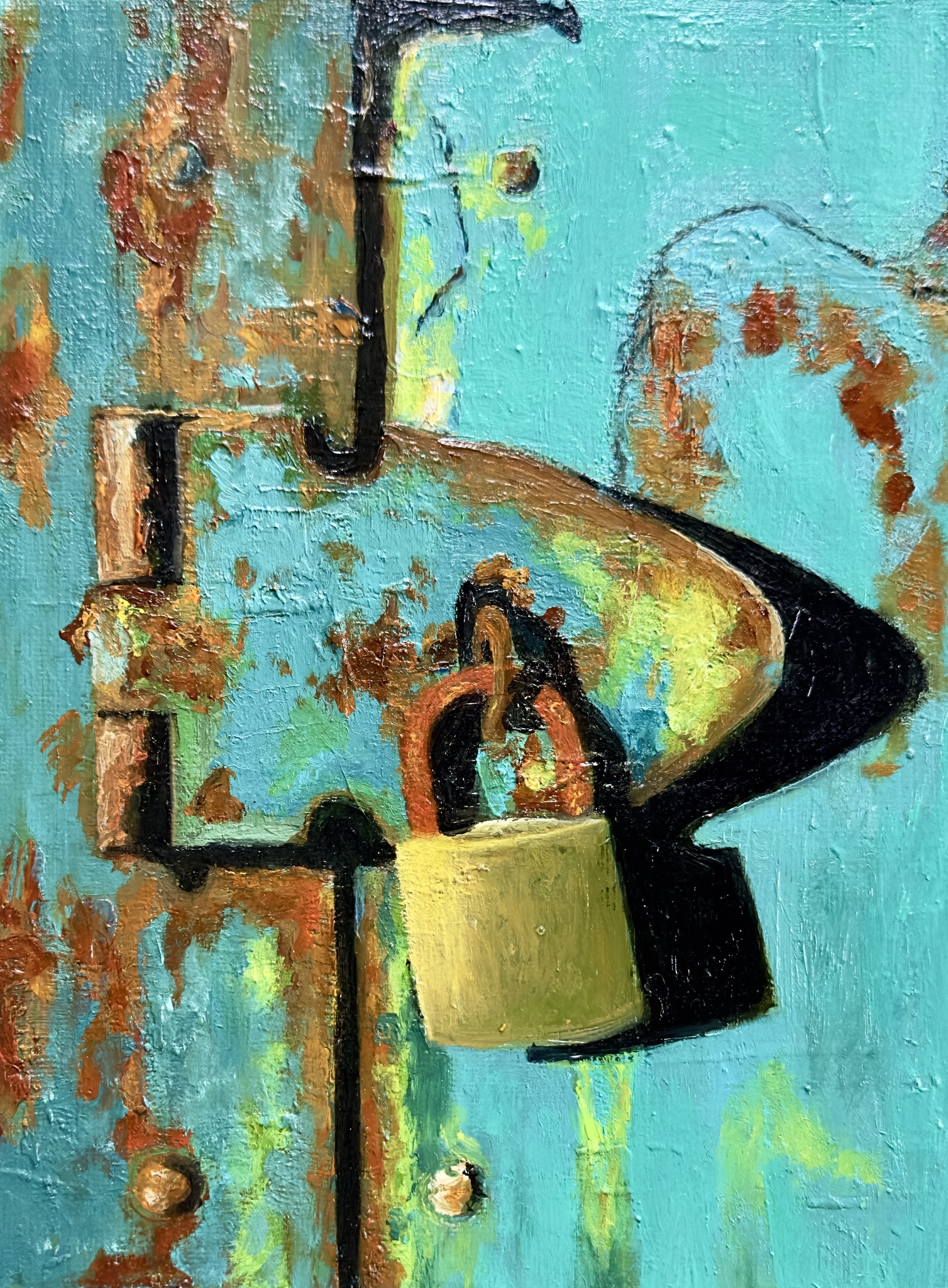 Schilderij Groen Klein Olieverf Doek Oud Roest Deur Slot Hangslot