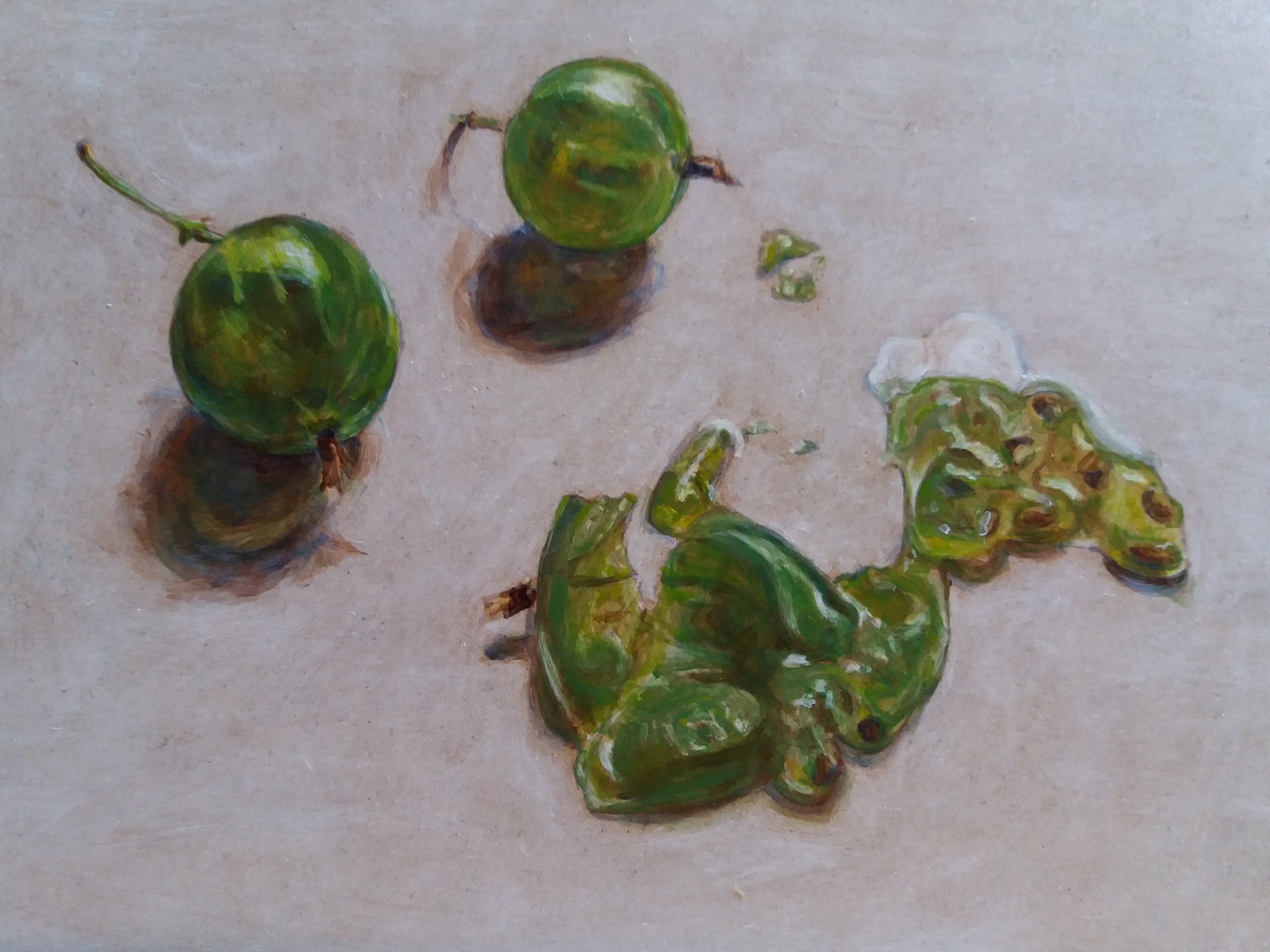 Kleine charmante werken op paneeltjes vaak A4-formaat. Portretten, bloemen, stillevens van fruit, glaasjes, doorkijken in het bos, een zicht met wachtende figuren….