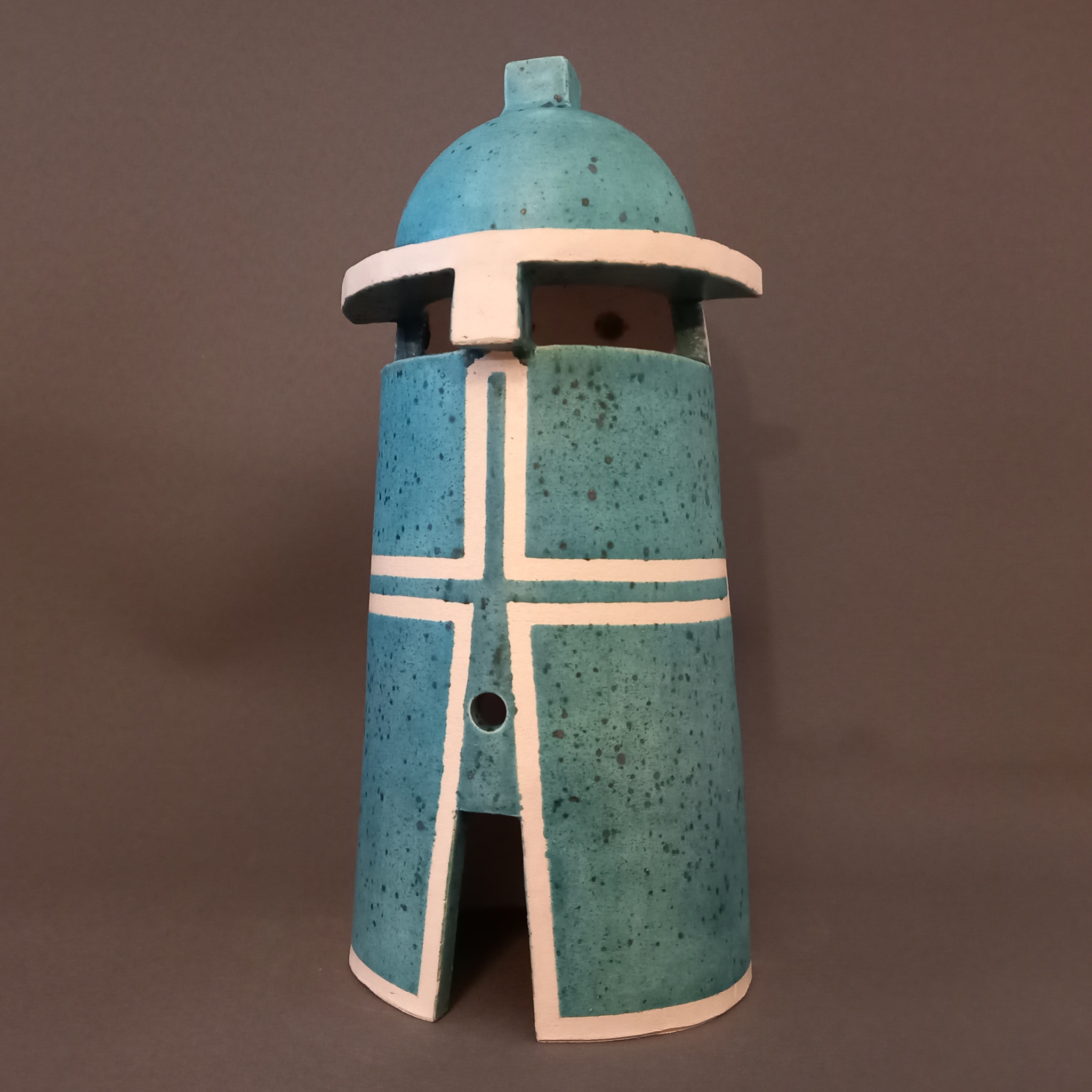 Viking Waaktoren. "Waakzaam"toren in witte klei en blauw-groen spikkelglazuur. "Noorse" decoratie d.m.v. uitsparing in de glazuur.