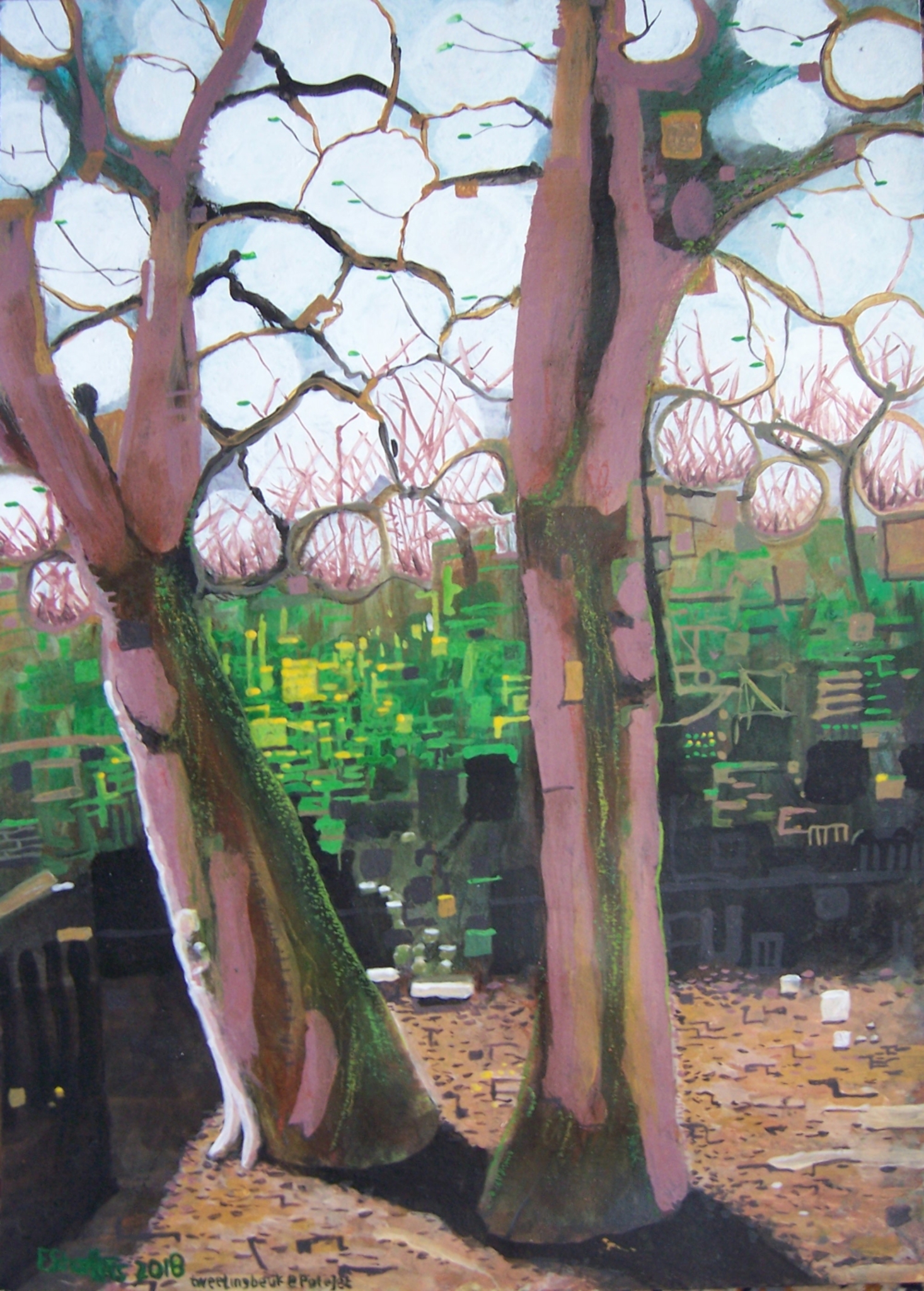 Op verzoek voor de kamer uitkijkend op de tweeling-beuk Deurneseweg.