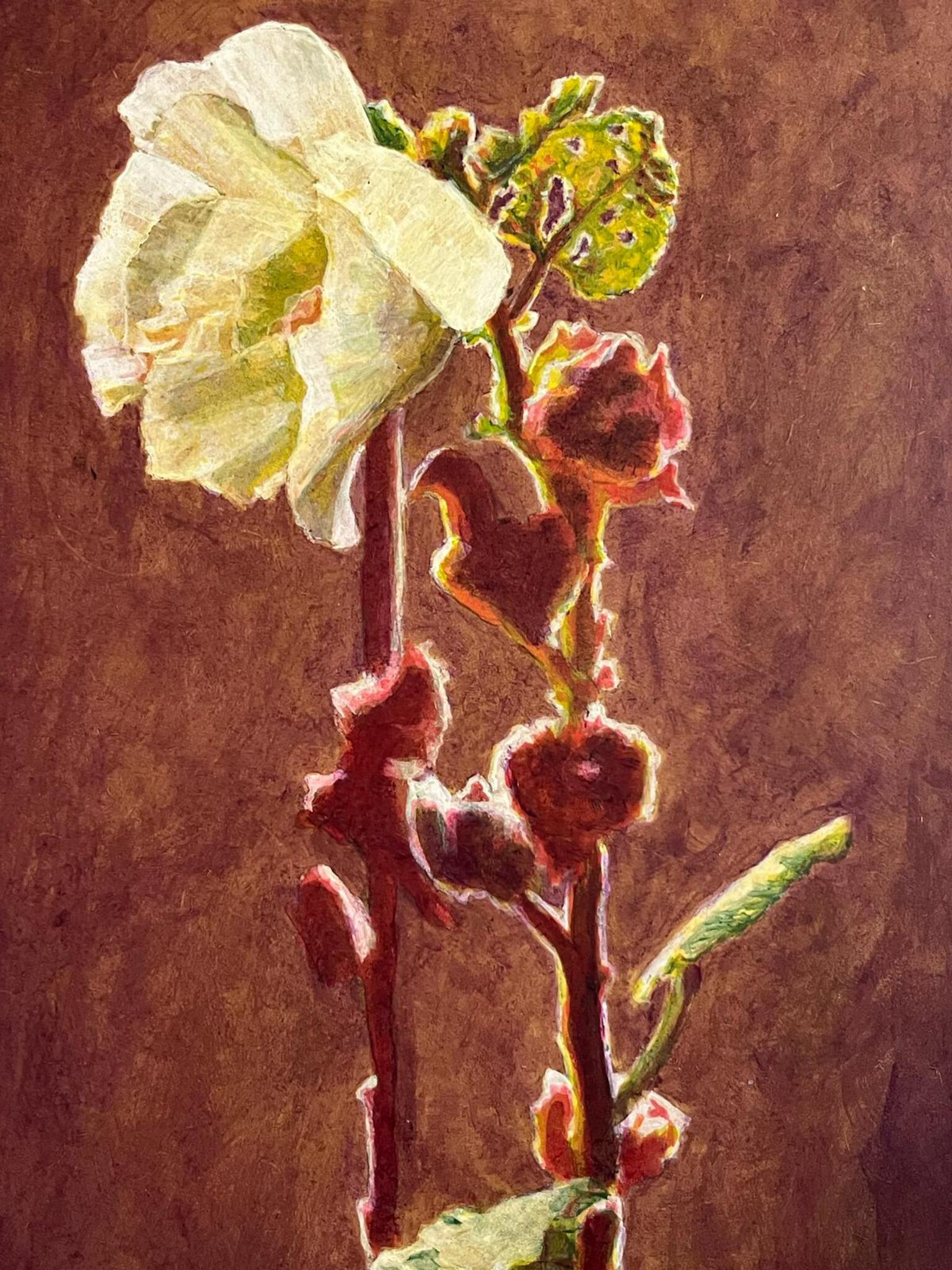 Witte stokroos met bloemknoppen in tegenlicht