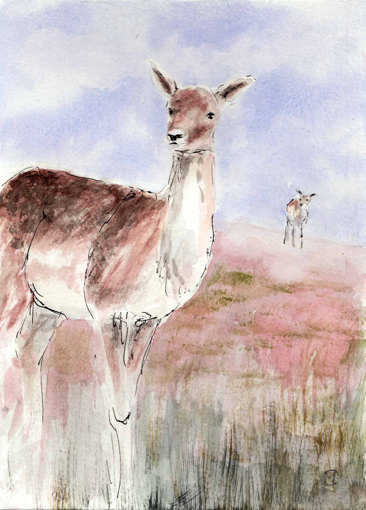 Twee herten alert op de heide Aquarel en pentekening met O.I. inkt Formaat aquarel 18 x 24 cm in passepartout van 28x35 cm.