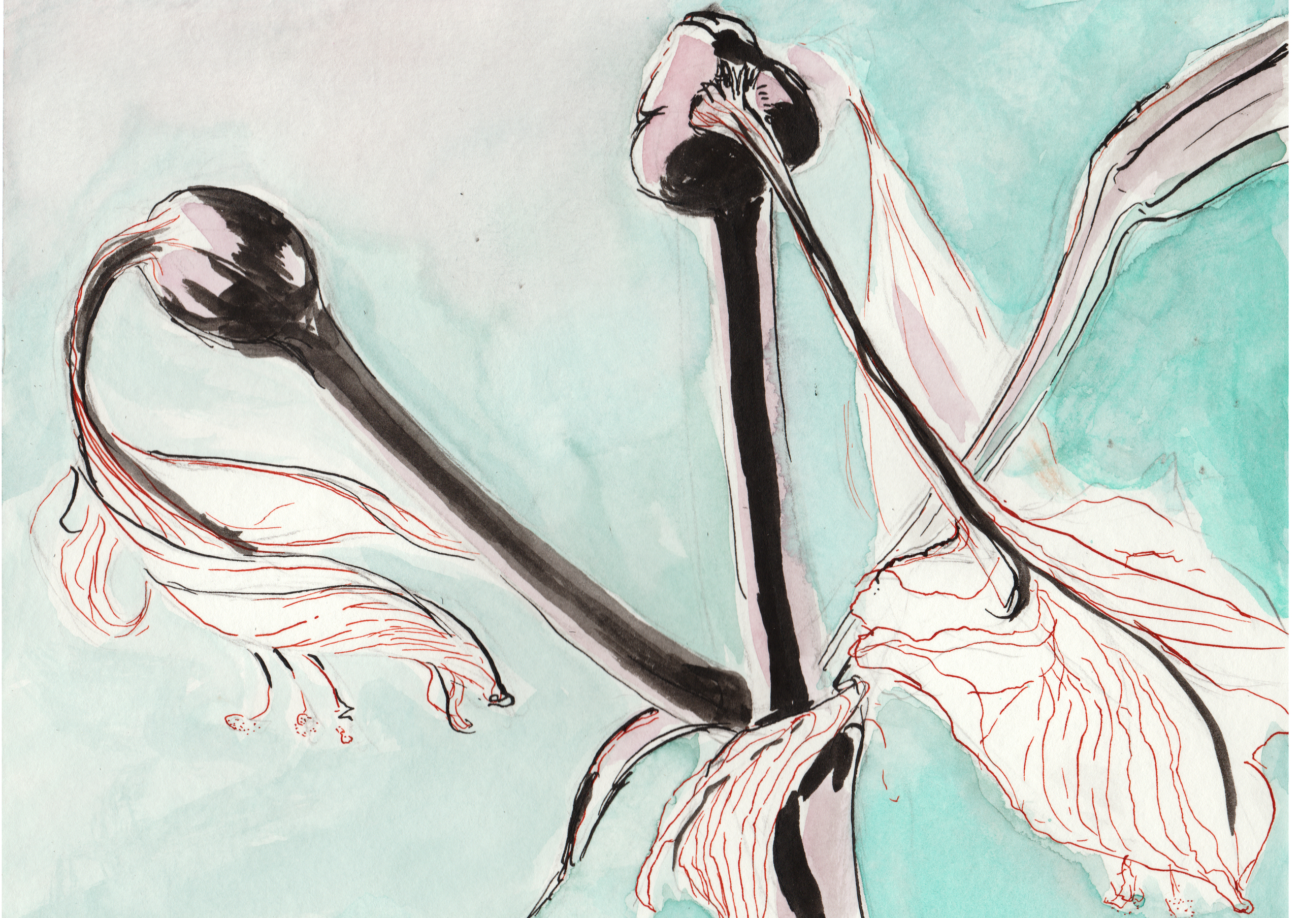 De lijnen van de uitgebloeide bloem zijn kreukelig en fijn geworden. Aquarel / pentekening Formaat 16x 24 cm passe-partout 28x35 cm