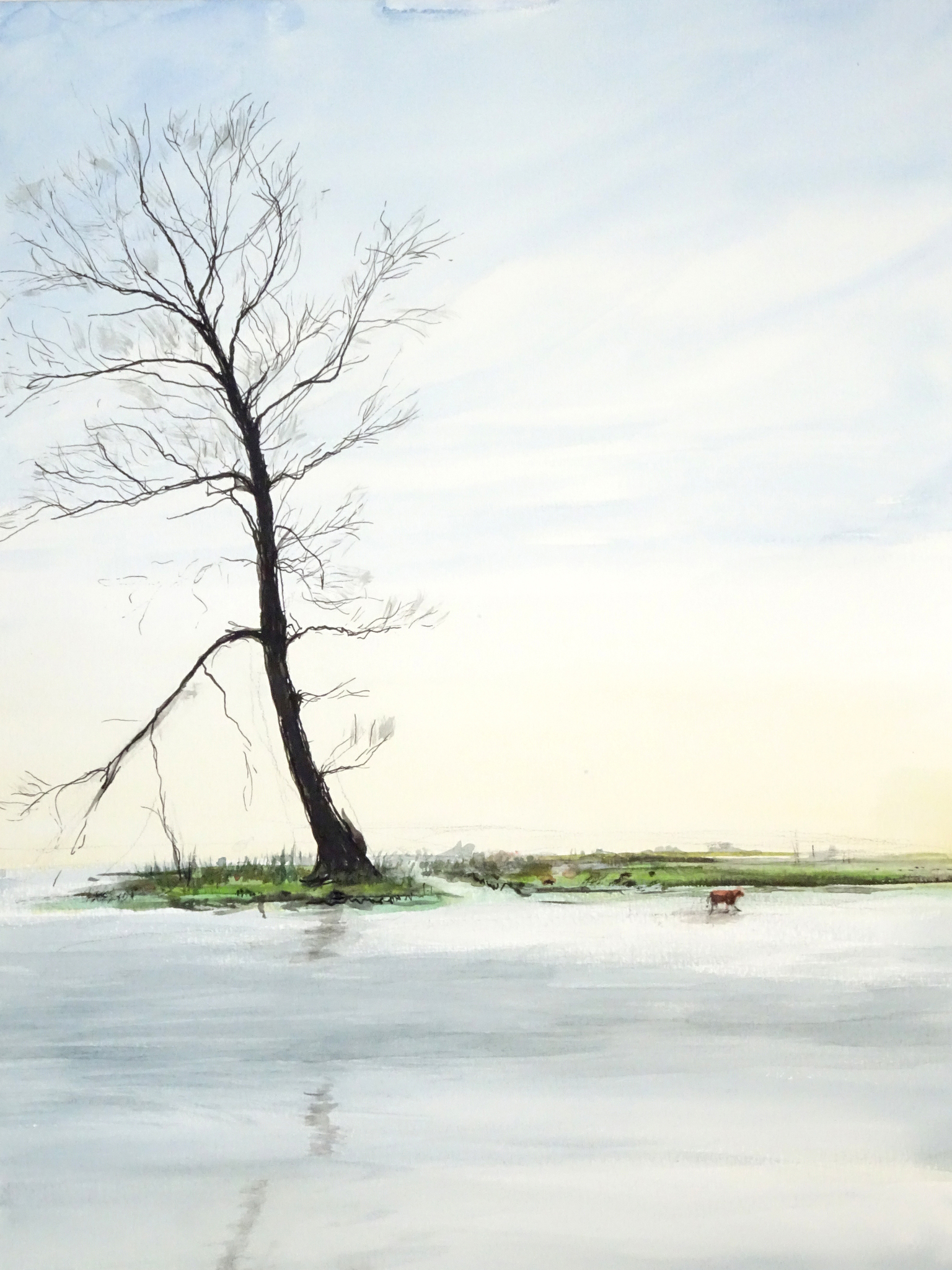 Begin lente. Een jonge koe loopt door het water langs de oever. Aquarel en pen Formaat 30x 40 cm in passepartout 40x50 cm.
