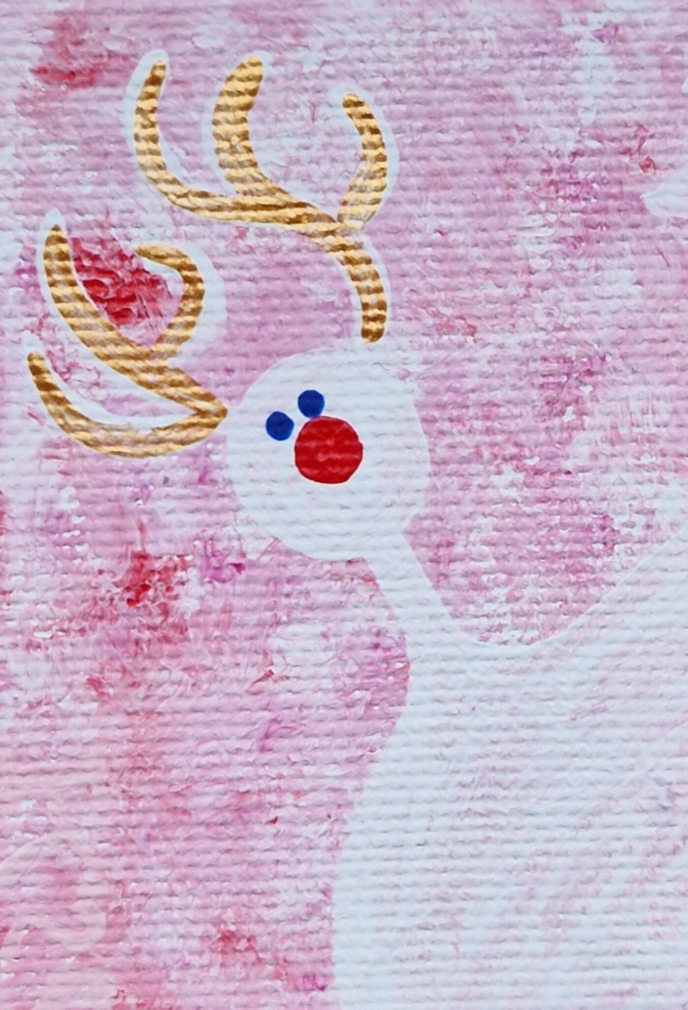 Decembercadeautje, verras jezelf of iemand anders met dit minischilderijtje, 7 bij 5 cm. Acrylverf op katoen, met een ophanghaakje aan de achterkant. November/december 2025; de prijs is inclusief decemberverpakking (rode achtergrond, met gouden sterretjes erop) en verzendkosten binnen Nederland (via Postnl).