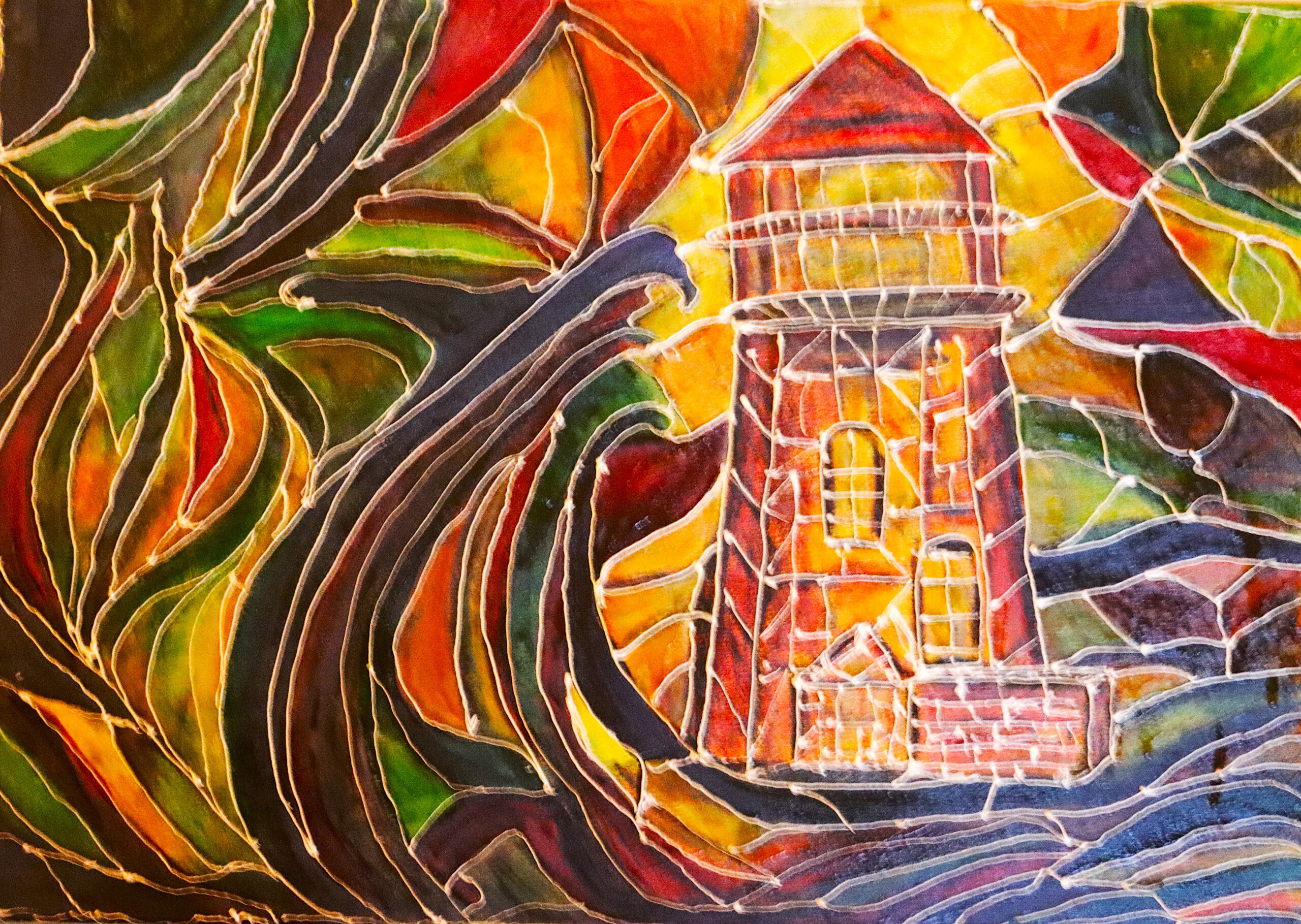 Vuurtorens spelen een belangrijke rol in mijn leven aangezien zo ongeveer aan de voet van de Van Speyk geboren ben. Héle verhalen heb ik daarover, dankzij mijn ouders. Zodoende spelen vuurtorens een belangrijke tol in veel van mijn werken. Voor mij symboliseren ze 'Thuiskomen' . Acry, vitrail, cerne relièf op doek.