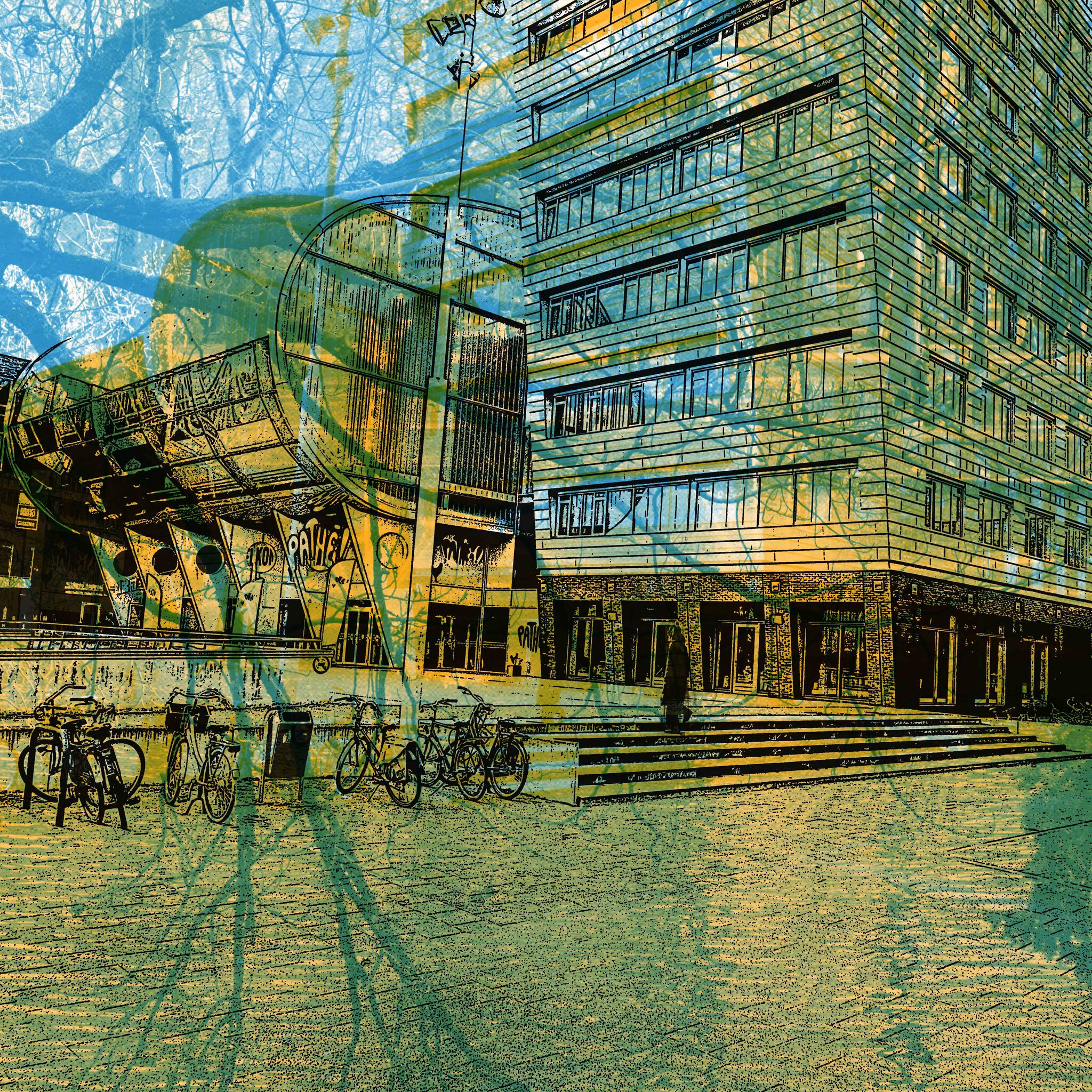 'Fietsen voor het Pathé, Breda' * te koop digitale art print, 50 x 50 cm, prijs: € 365 (inclusief lijst, of op dibond) (diverse formaten zijn mogelijk, naar uw wens - de prijs variëert dan mee) Te huur bij Business Art Service in het formaat van 90 x 90 CM https://www.kunst.nl/kunstenaars/hilly-van-eerten/