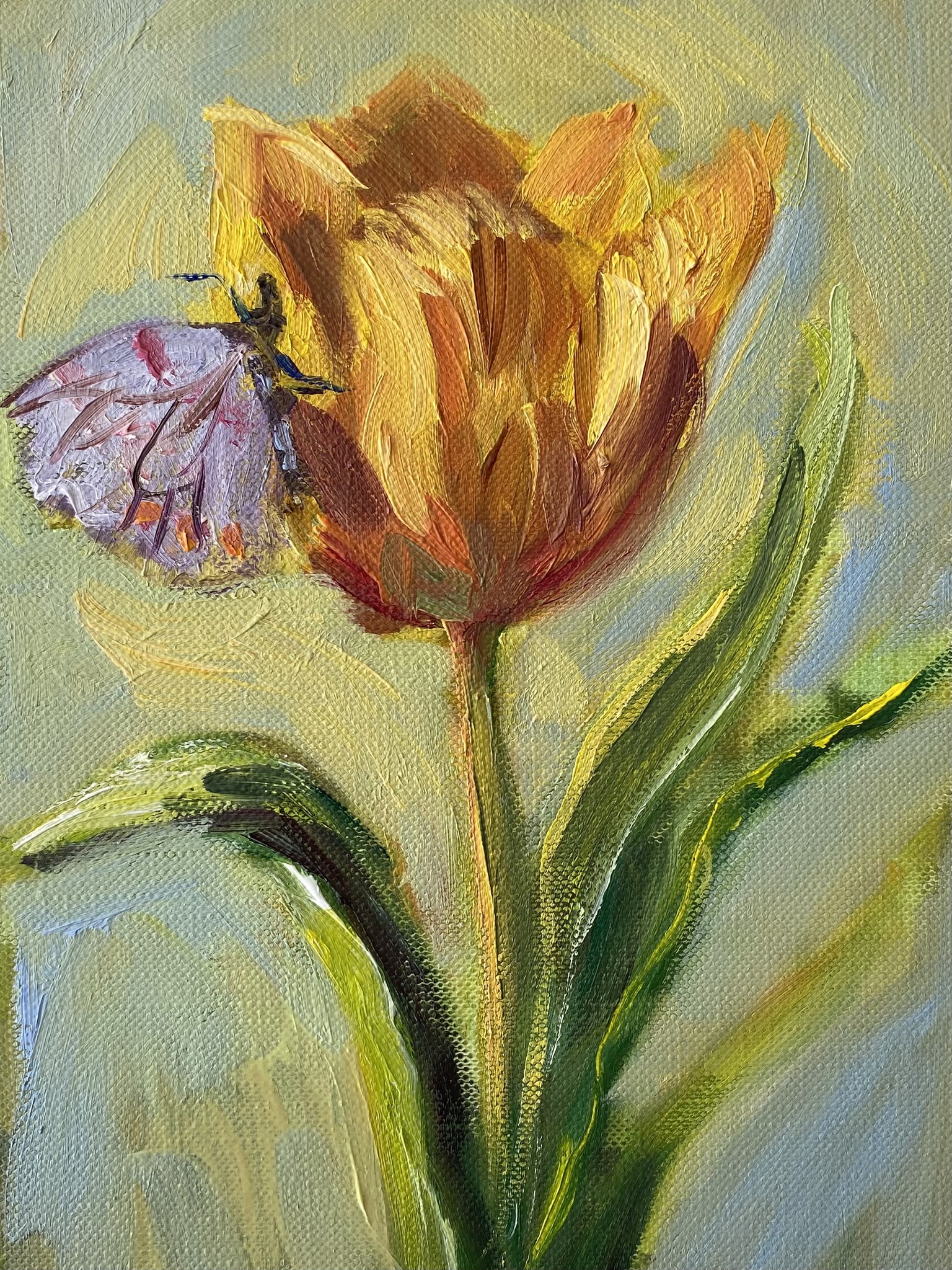 Tulp met vlinder / Verlangen (2025) Olieverf op papier | 10 x 15 cm