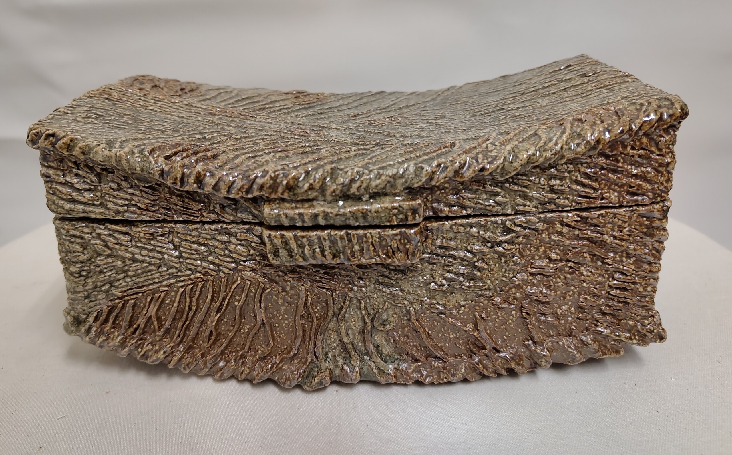 Doos geïnspireerd door de natuur. Steengoed (hoogstook in reductie), zelfontwikkelde glazuur vanuit gevonden klei, zoutstook.