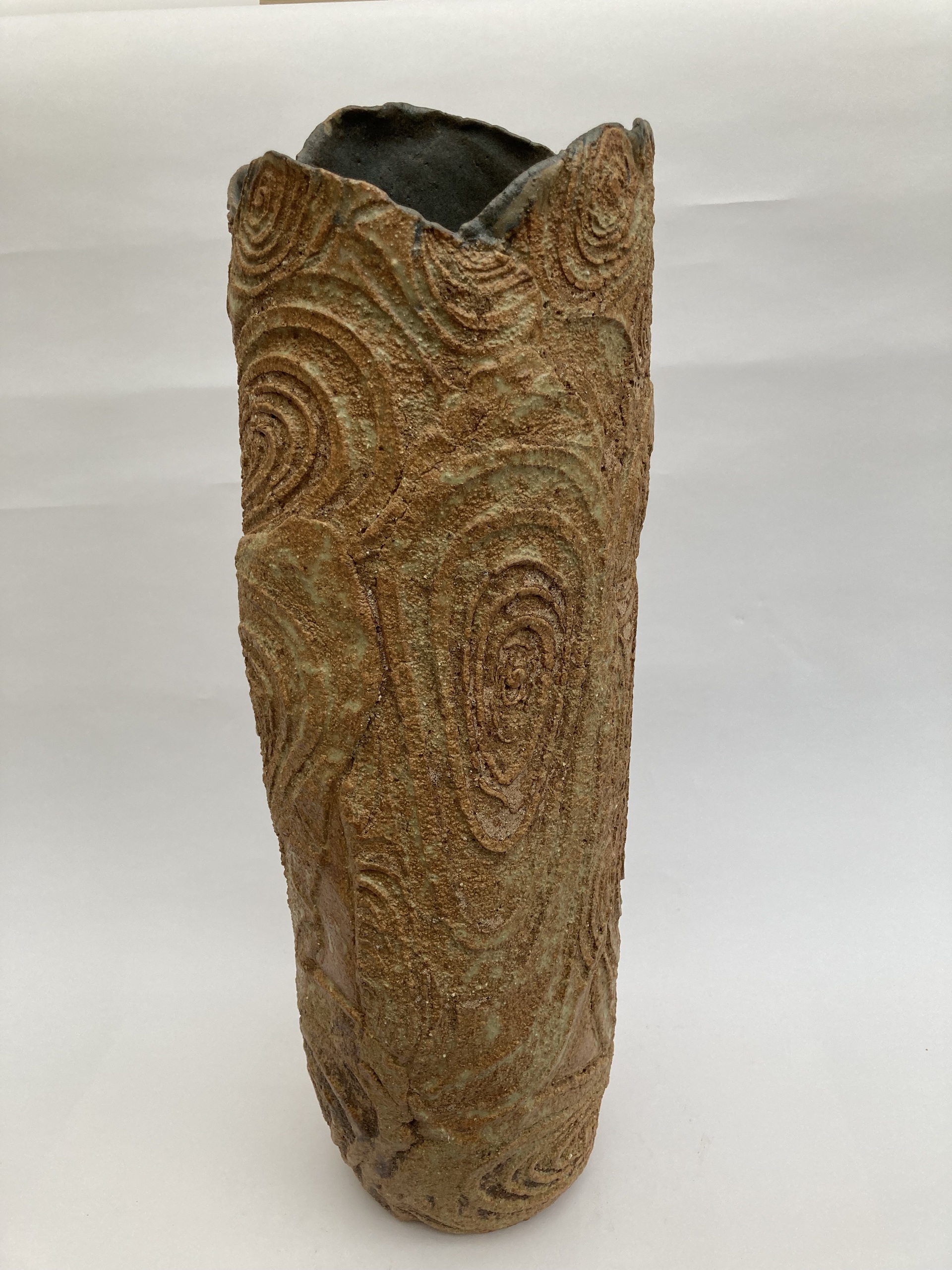 Handgevormd uit lapjes klei met textuur. Steengoed (gestookt op hoge temperatuur in oxidatie). Glazuur ontwikkeld vanuit gevonden klei.