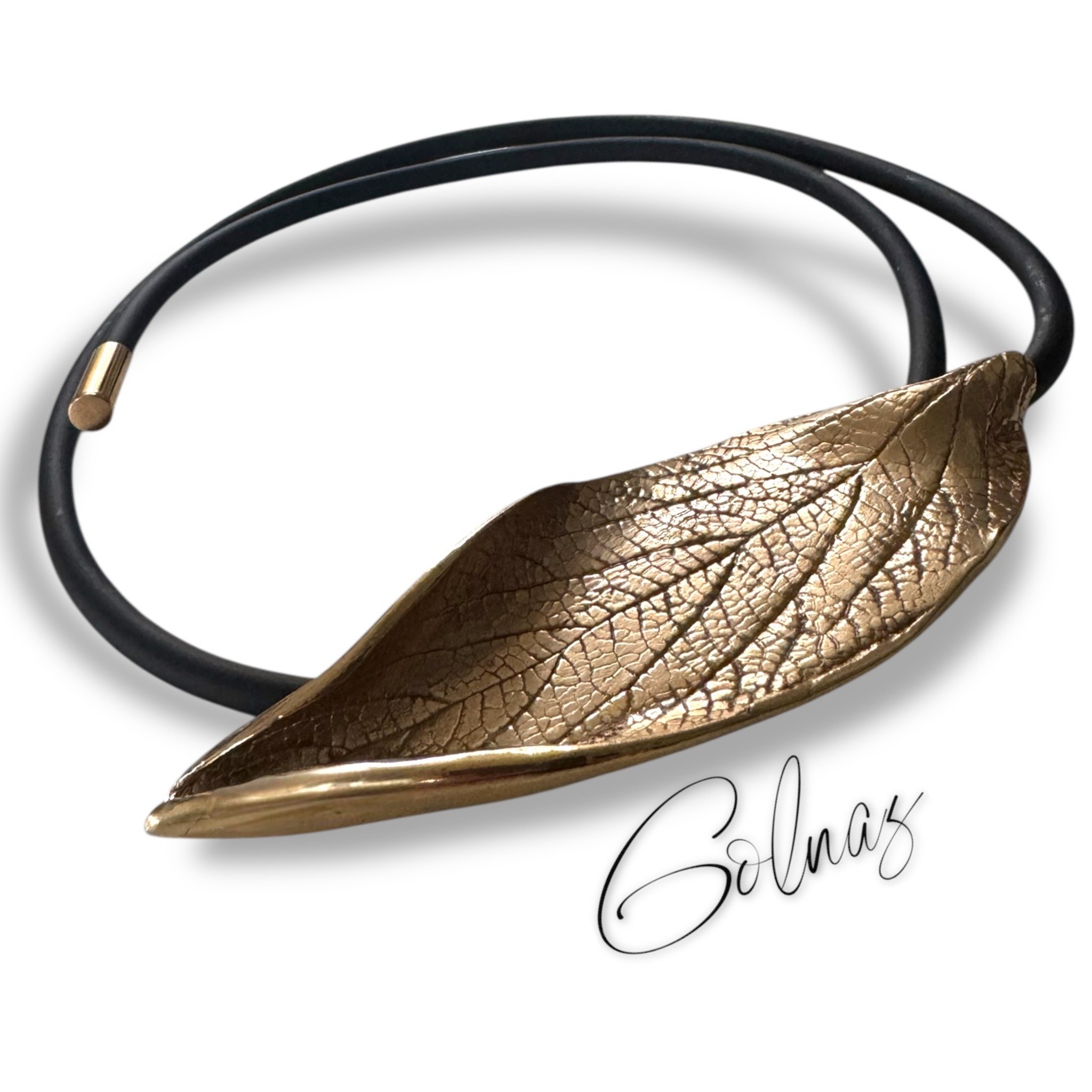 Bronzen sieraad in de vorm van een blad aan spang van rubber