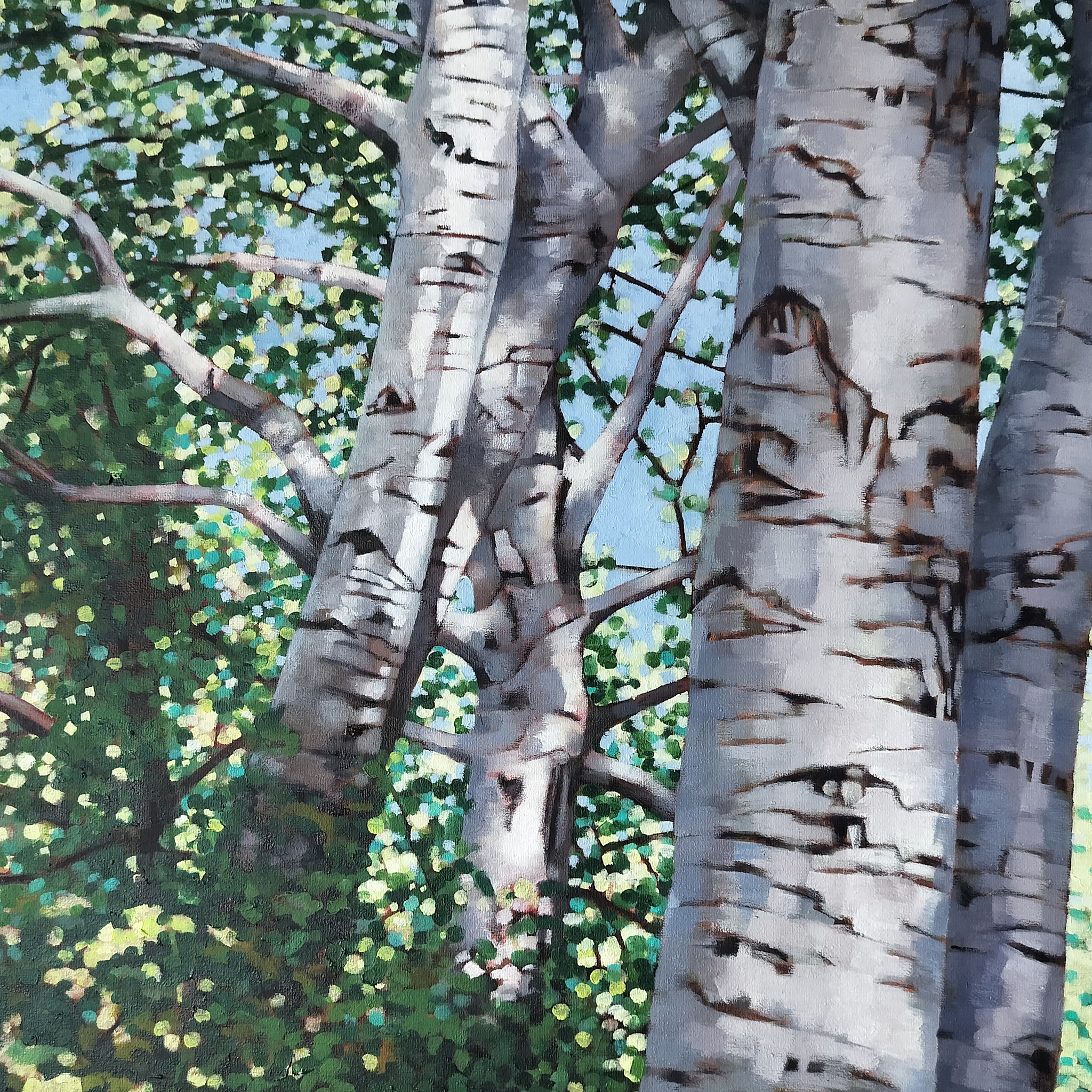 Dit schilderij geeft een impressie van het licht op de stammen van de abelen in het bos op een zomerdag.