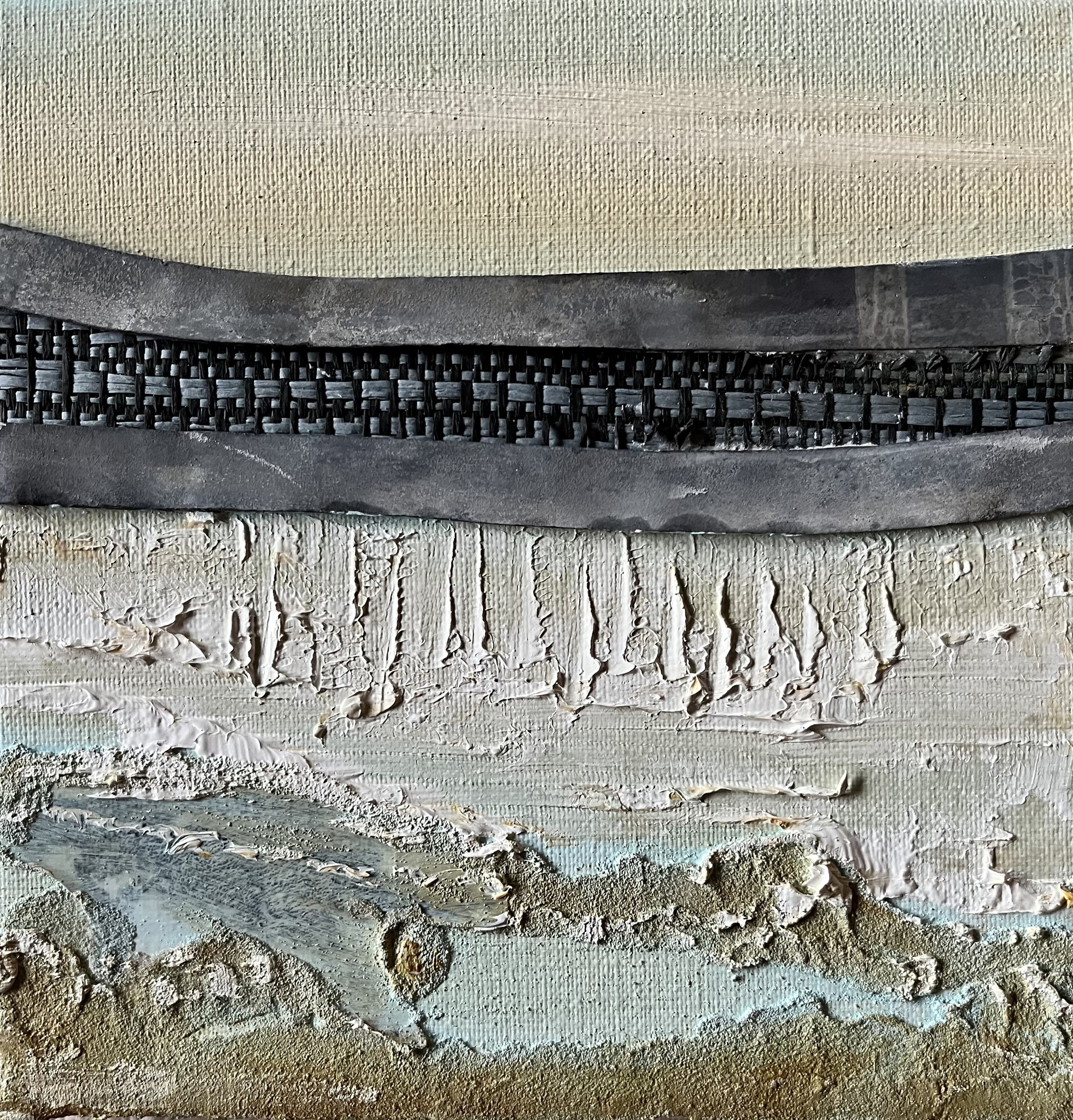 Wad Waddenkunst Wadden Landschap Mixedmedia Groen Verstild Lood Natuurlijkematerialen Organisch Doorwerkt Gelaagd Collage Water Aqua Stromen Zee Vergezicht