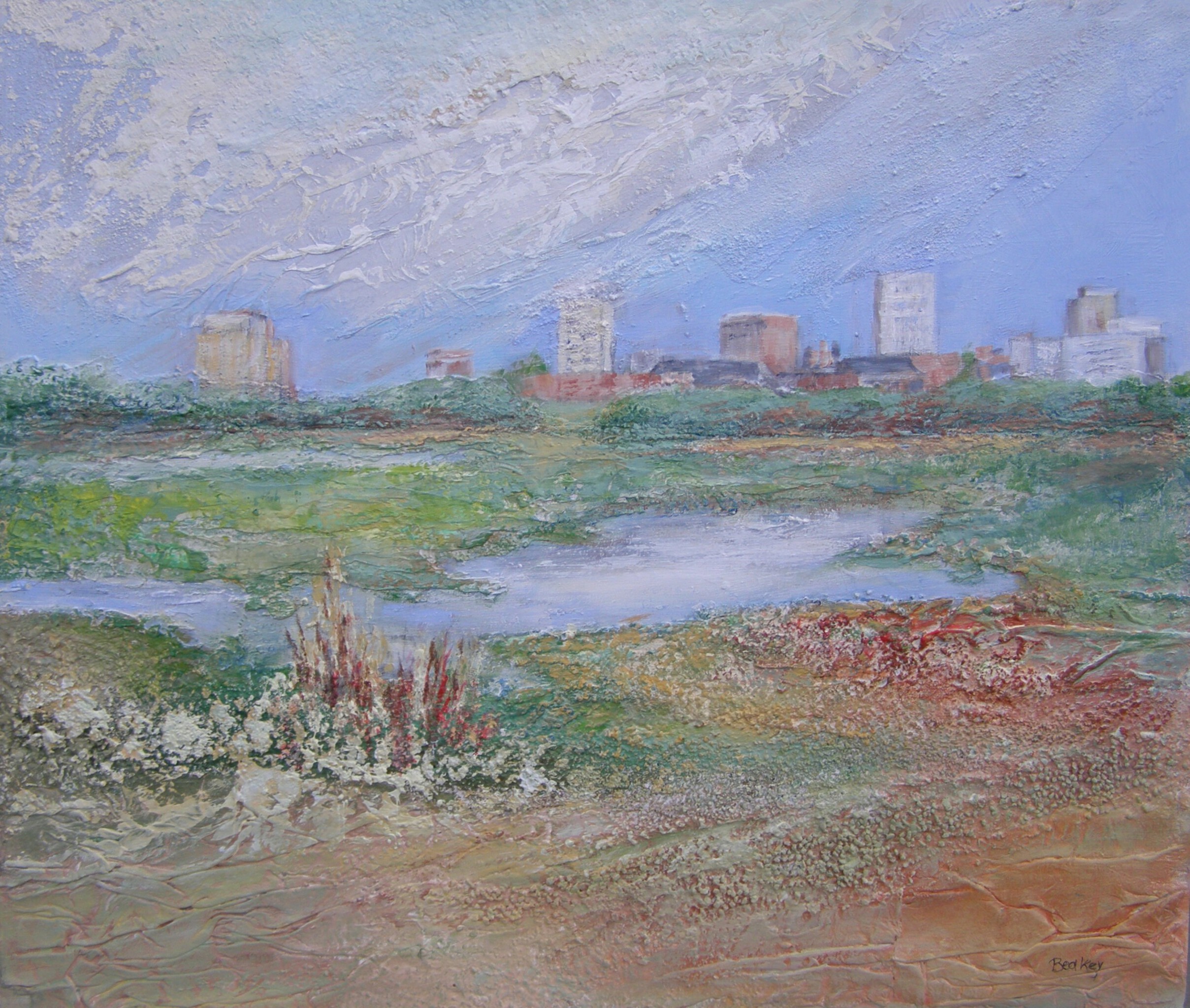 Haar schilderijen in gemengde techniek zijn geinspireerd door haar reizen in binnen-en buitenland. Schetsen en aantekeningen zijn het vertrekpunt, maar worden tot hun essentie in vorm en kleur teruggebracht.