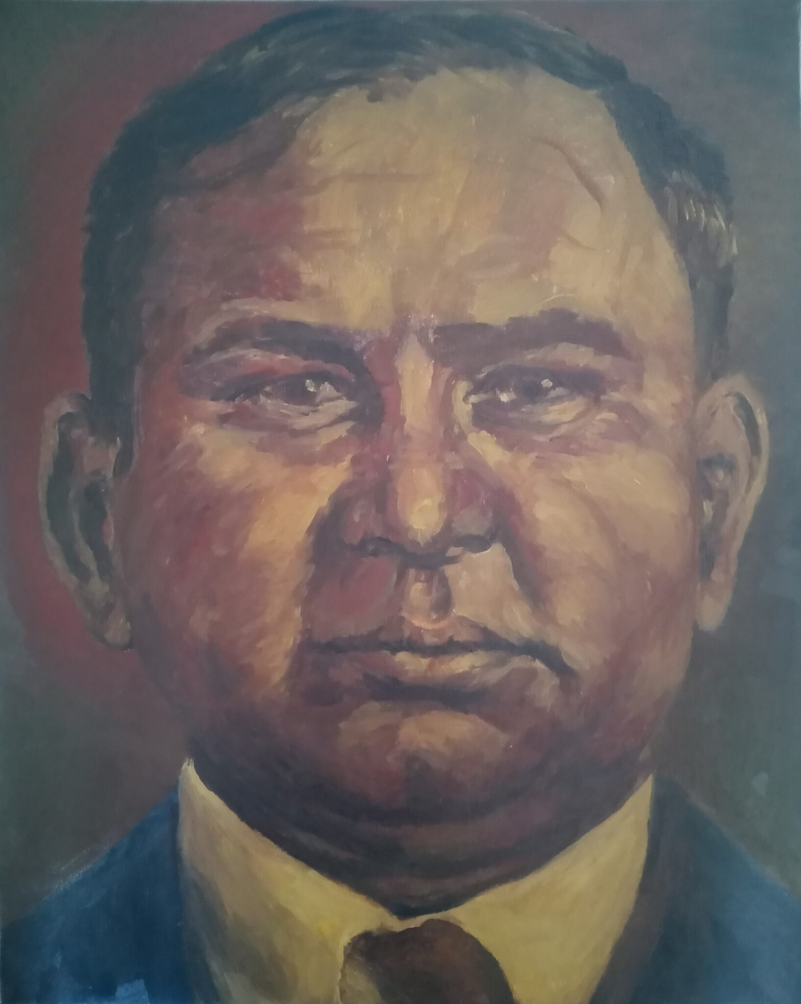 Professionele kwaliteit olieverf op Claessens oliegeprepareerd linnen Uit de serie Mugshots, een reeks portretten gebaseerd op de originele politiefoto’s. Een verzameling gezichten van de sleutelfiguren uit de onderwereld in de VS van rond de jaren ’30 ten tijde van de ‘drooglegging’. De periode van Al Capone, een periode waarin grote groepen immigranten via New York hun geluk beproefden in de Nieuwe Wereld, een land van vrijheid en onbeperkte mogelijkheden. Een deel zocht zijn heil in clandestiene handel en praktijken en kwam zo in de georganiseerde criminaliteit terecht. Vaak al van jongs af aan. Wat zeggen deze gezichten ons? Valt er iets te lezen over de psychologie in de gezichten van de leidende onderwereldfiguren uit die tijd? Reinout J. Zikel heeft zijn opleiding gevolgd aan de Koninklijke Academie van Beeldende Kunsten in Den Haag.