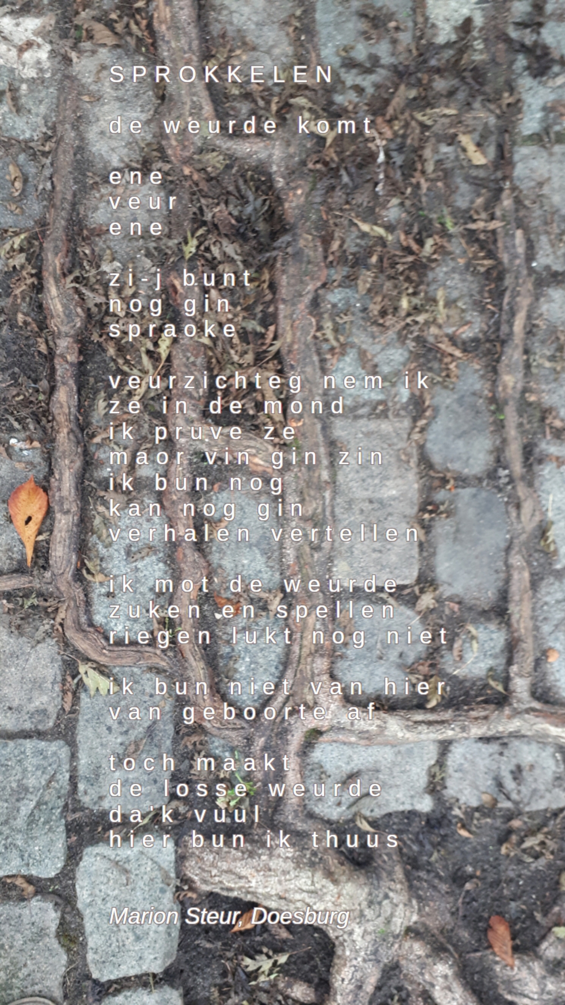 Schoorvoetend zet ik mijn eerste stappen in streektaal. Apetrots ben ik dat mijn Achterhoekse gedicht Sprokkelen is opgenomen in de verzamelbundel Fier dyn eigen taal met 222 gedichten in kleine talen. Het staat op bladzijde 216. De bundel heeft ISBN 978-90-8566-069-9 en is te koop via Utjouwerij Frysk en Frij.