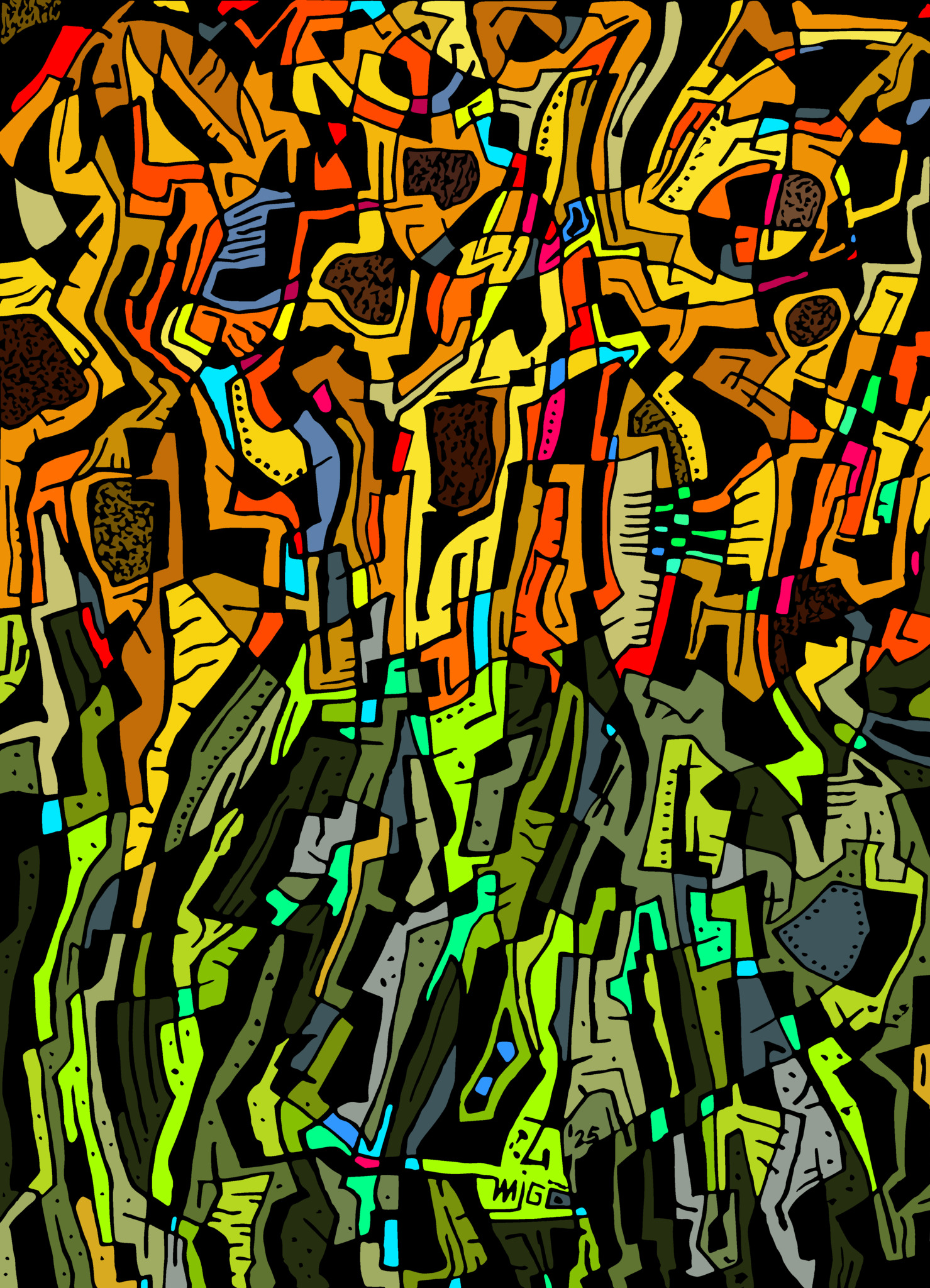 Ontstaan uit een vrije en expressieve verkenning van lijnen en vormen met Oost-Indische inkt.