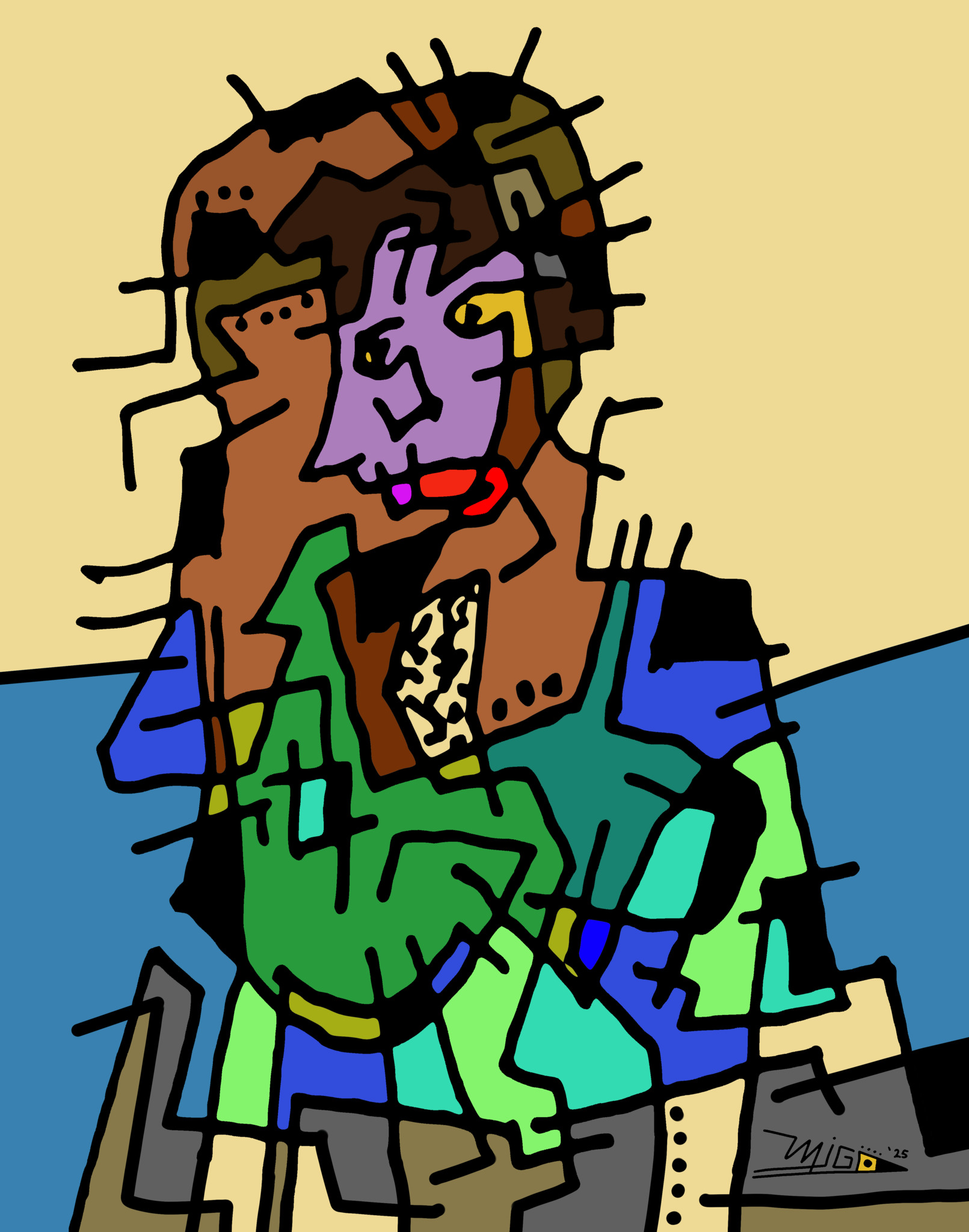 Maurice tekent op papier met pen en inkt en op iPad. Het drukke lijnenspel met opmerkelijke kleurcombinaties van patronen en figuratieve elementen biedt een ontsnapping aan de dagelijkse sleur.