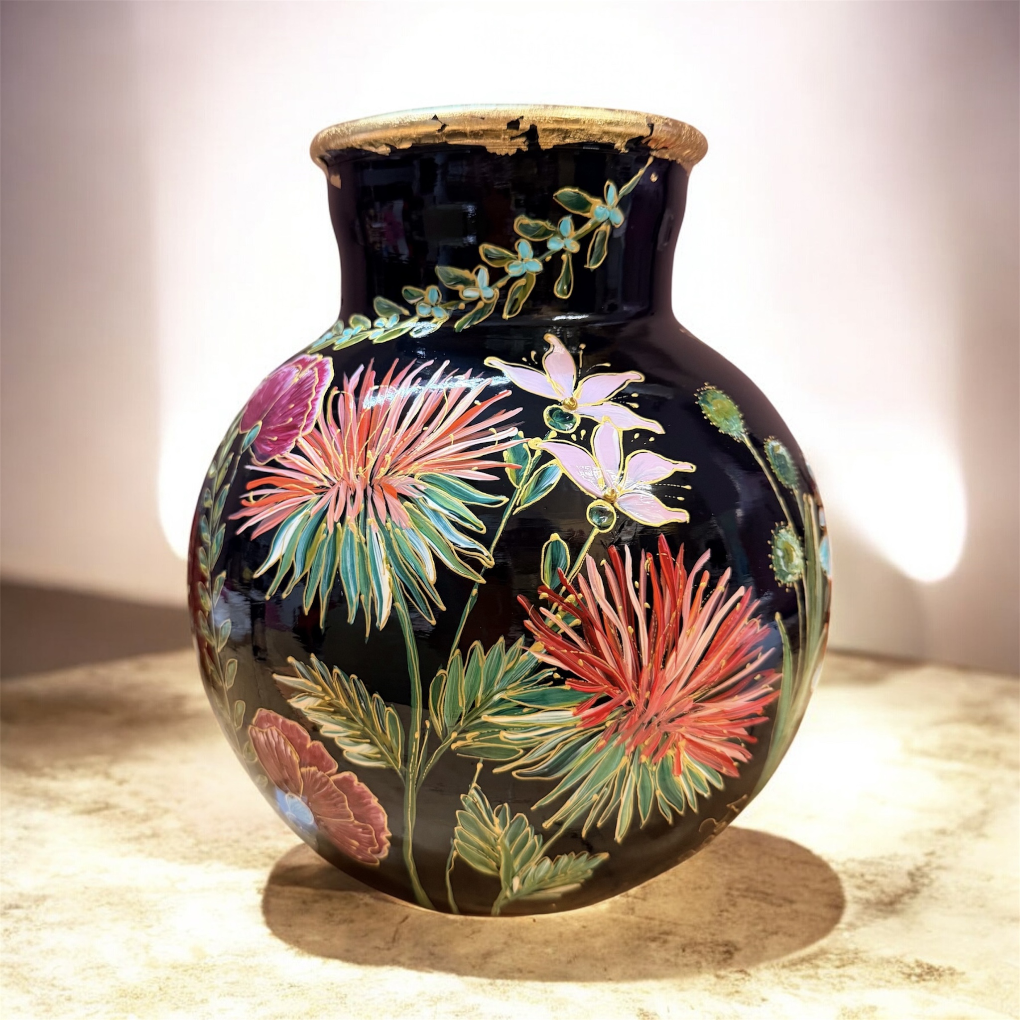 Vaas in glanzend zwart. Rondom beschilderd met bloemen.
