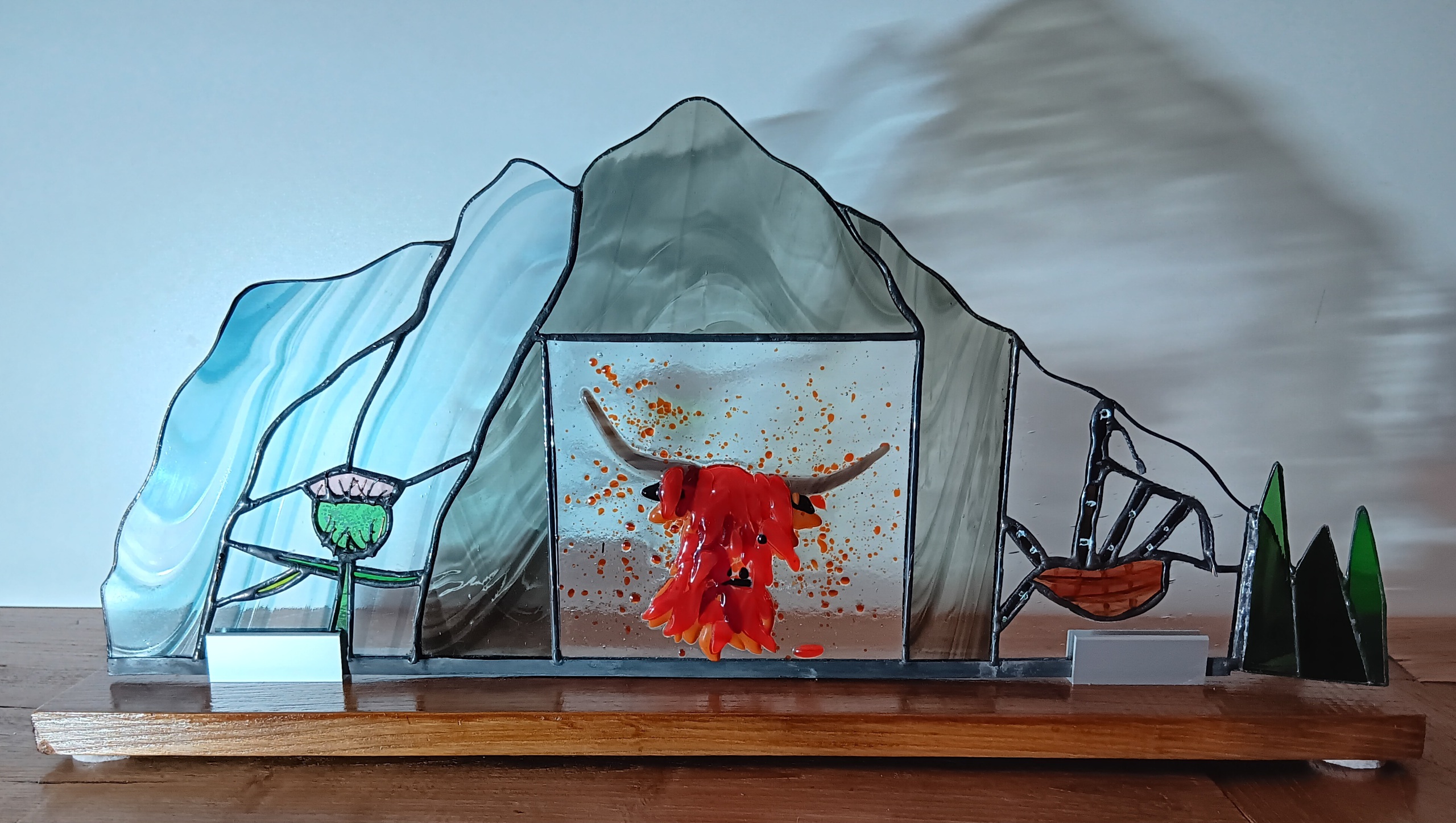 Scotland - Geïnspireerd door het landschap en erfgoed van Schotland, combineert ons glas-in-loodwerk glasfusie met de Tiffany-koperfolietechniek. Elk stuk is handgemaakt in Schotland en vangt licht, kleur en vakmanschap in een eigentijdse uitdrukking van traditie.