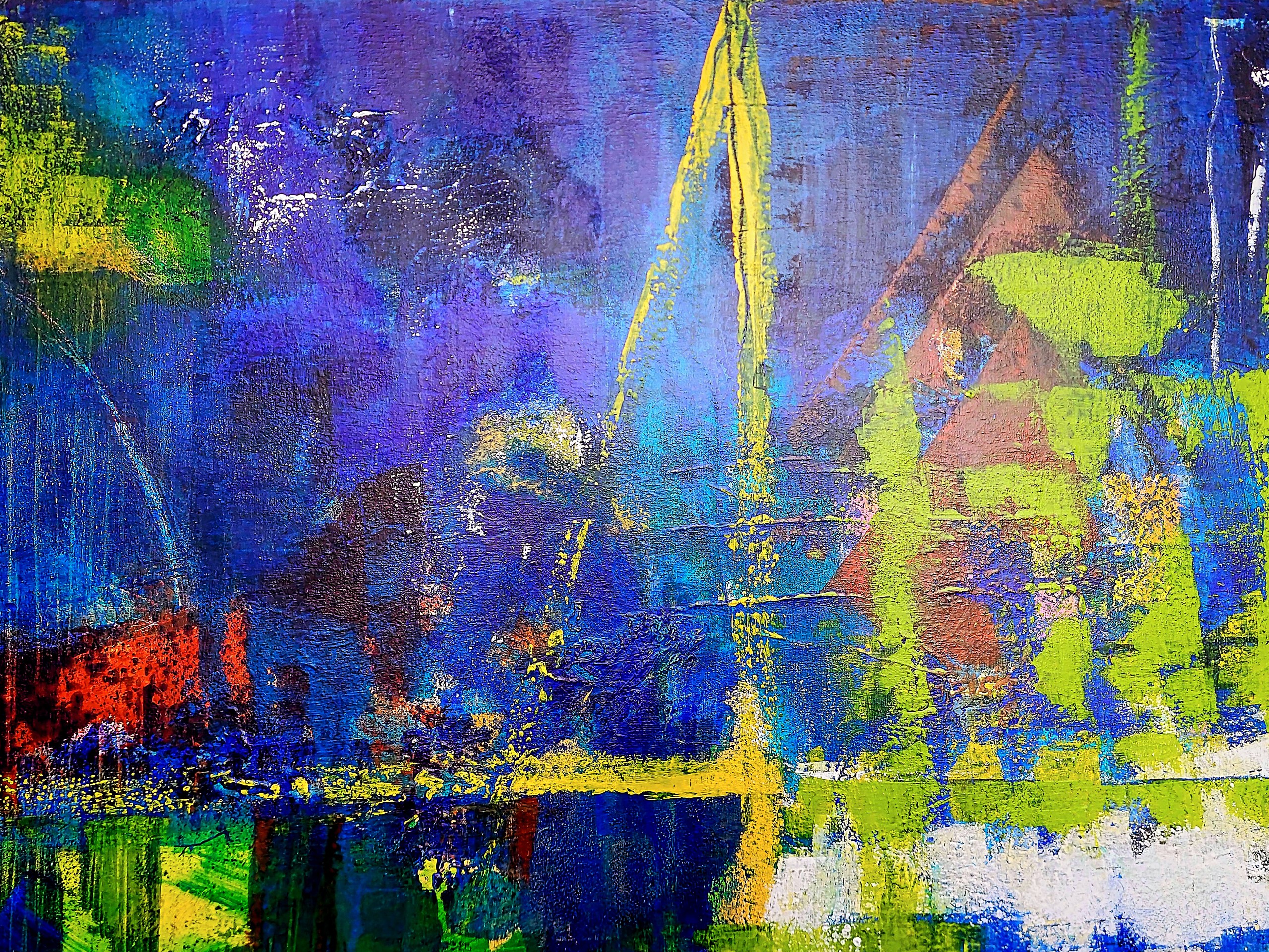 Mensen die dit schilderij voor het eerst zagen, riepen bijna in koor: Rotterdam! Hoewel ik in Rotterdam ben geboren, was het niet mijn bedoeling om een stukje van de stad op deze manier te schilderen. Maar wanneer je in de flow zit, schildert een schilderij zich soms als het ware zelf. Met een beetje fantasie zou je er de Erasmusbrug in kunnen herkennen.