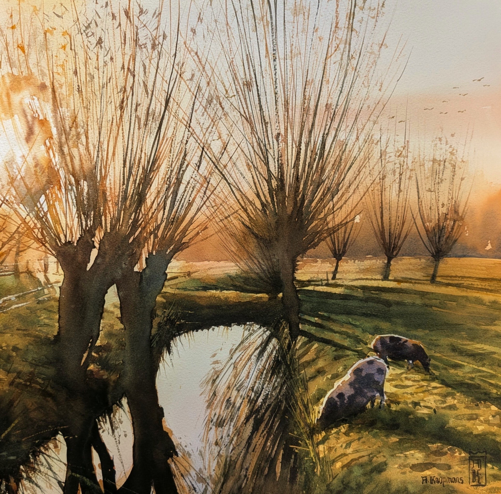 Mijn werk is vooral een ode aan het Nederlandse landschap, de steden, het water, een enkel buitenlands avontuur. Met de transparantie van aquarel schilder ik licht en kleuren op de mooiste momenten.