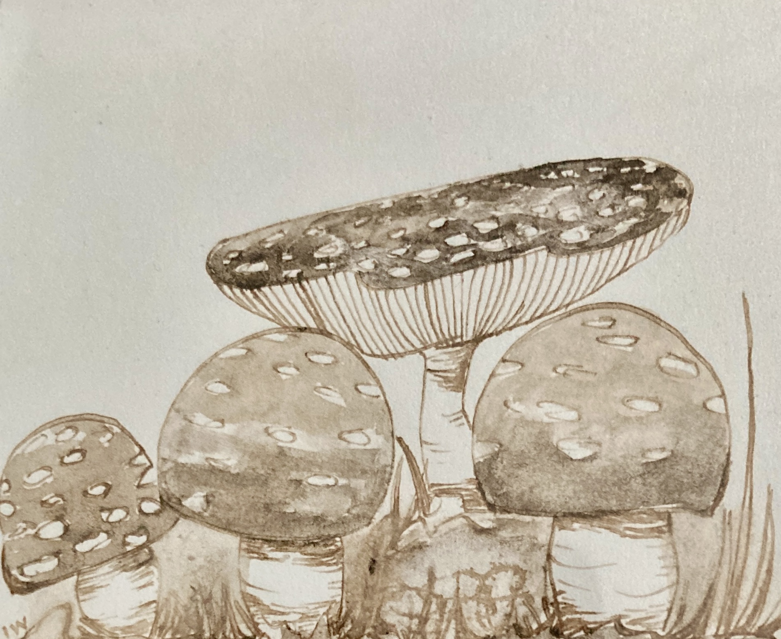 Vliegenzwammetjes getekend met inktzwammeninkt.