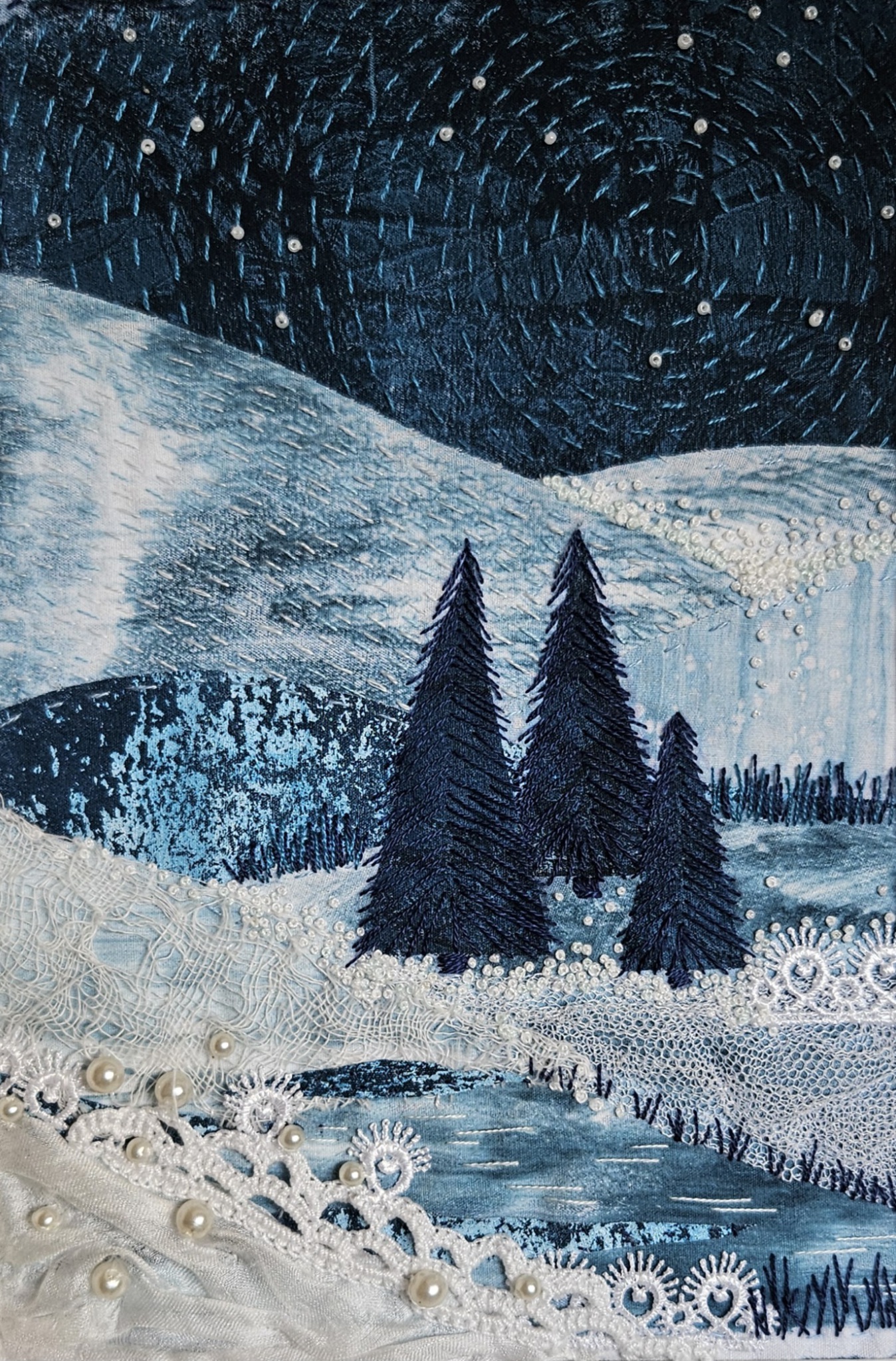 Collage met geverfde textiel, verfijnd met borduurwerk