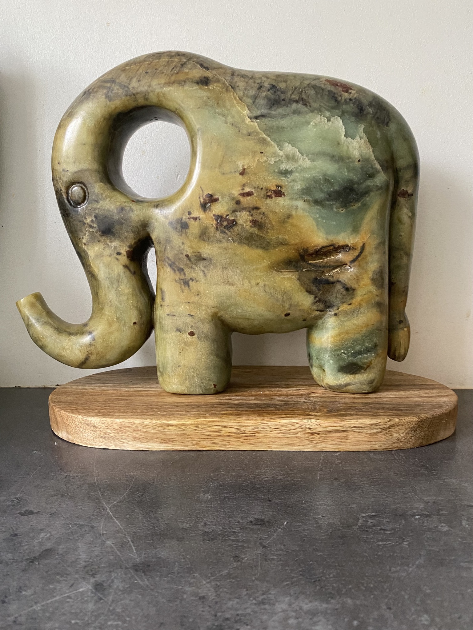 De oren heb ik weergegeven als grote gaten en de kleuren van de steen lijken op een landschapschilderij.