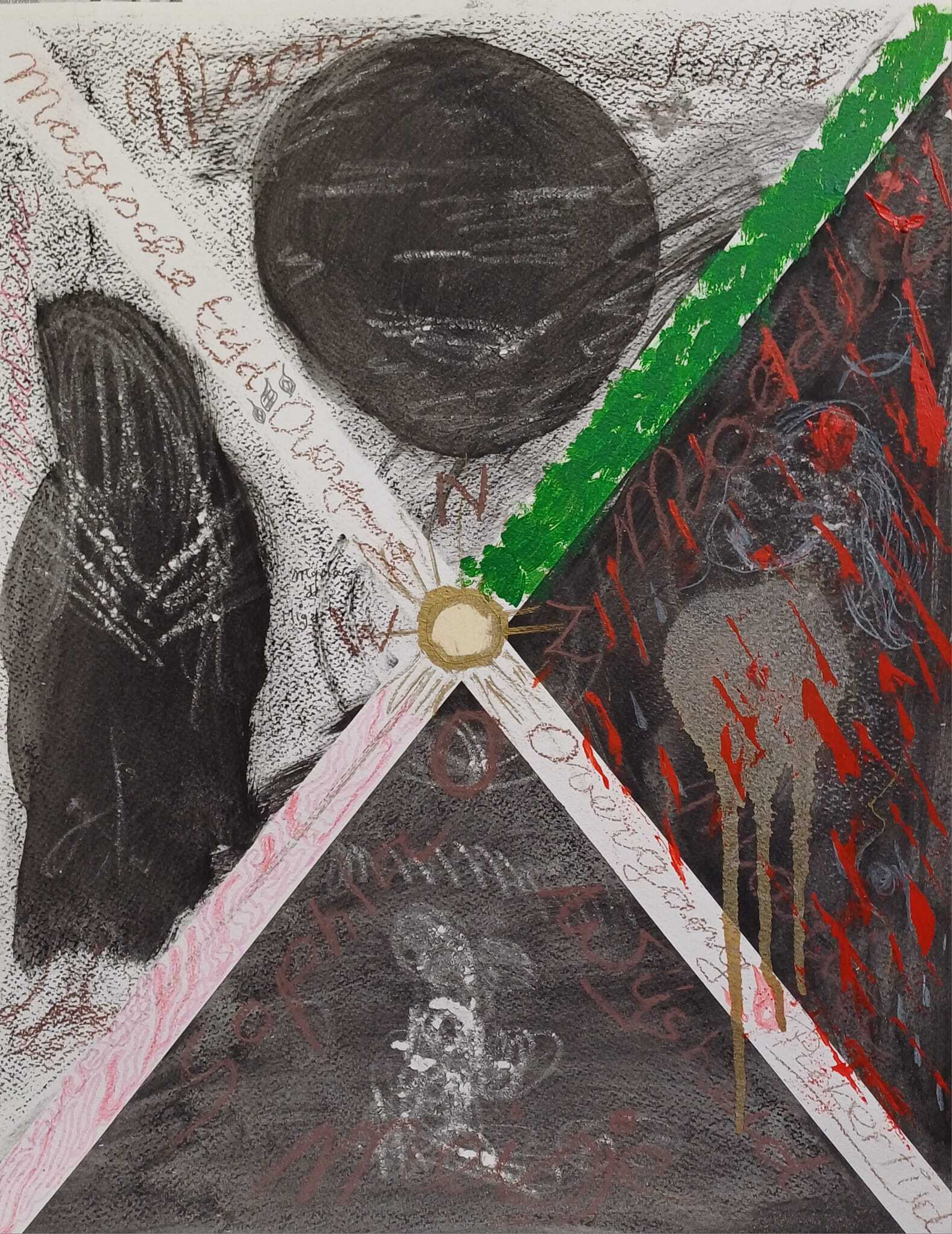 De Vier Vrouwen: Sophia (het wijze Kind), Maria (de Moeder), Magdalena (de bewuste Vrouw) en Grootmoeder Anna (als Maan) in één houtskooltekening. Vier uitdrukkingen van de aspecten van het vrouw-zijn in één Tekening