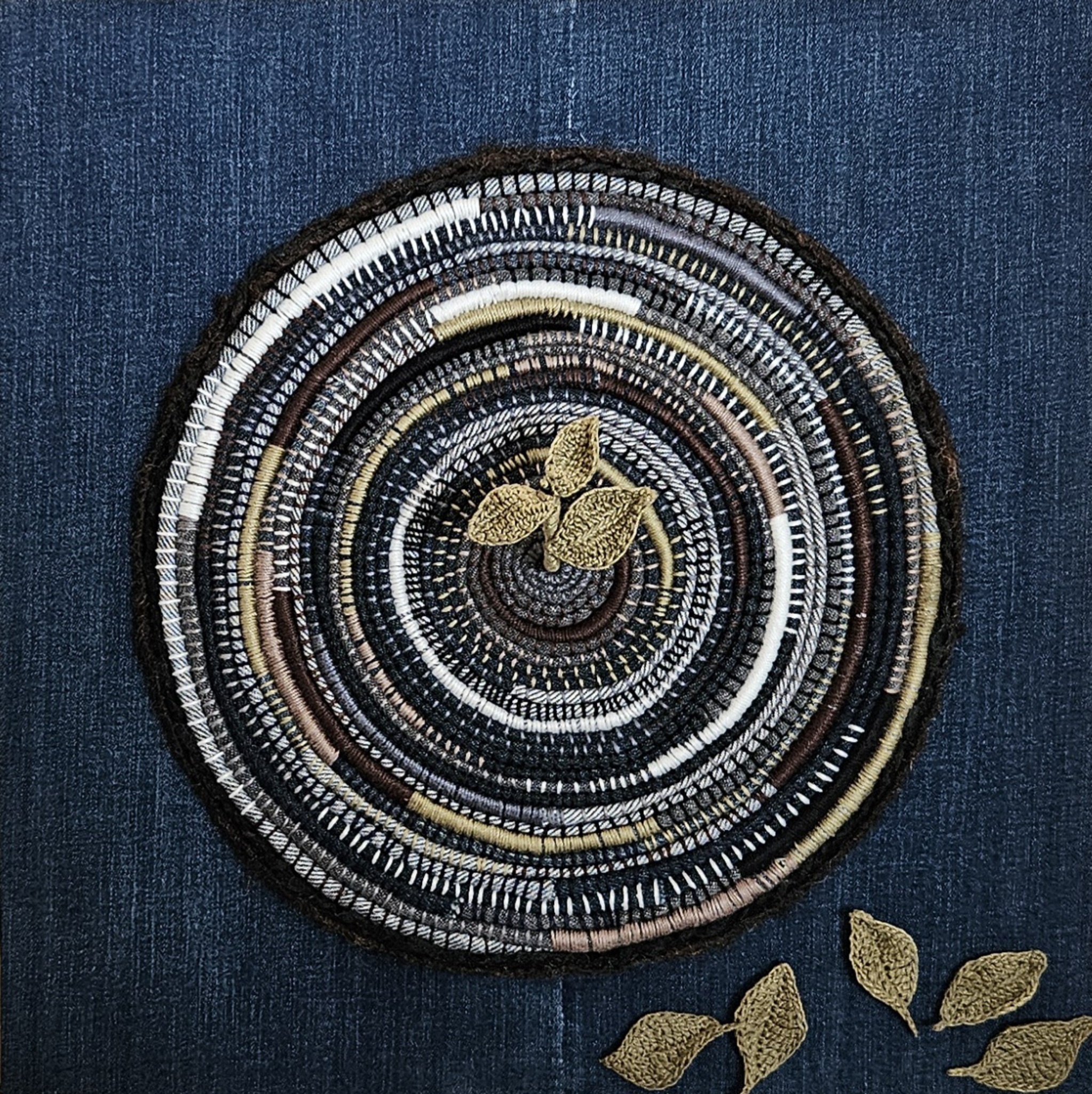Stroken van oude spijkerbroeken zijn spiraalsgewijs aan elkaar geborduurd, waarbij zowel het het garen, de steken als de denimkleuren voor variatie zorgen. Afgwerkt met gehaakte blaadjes.