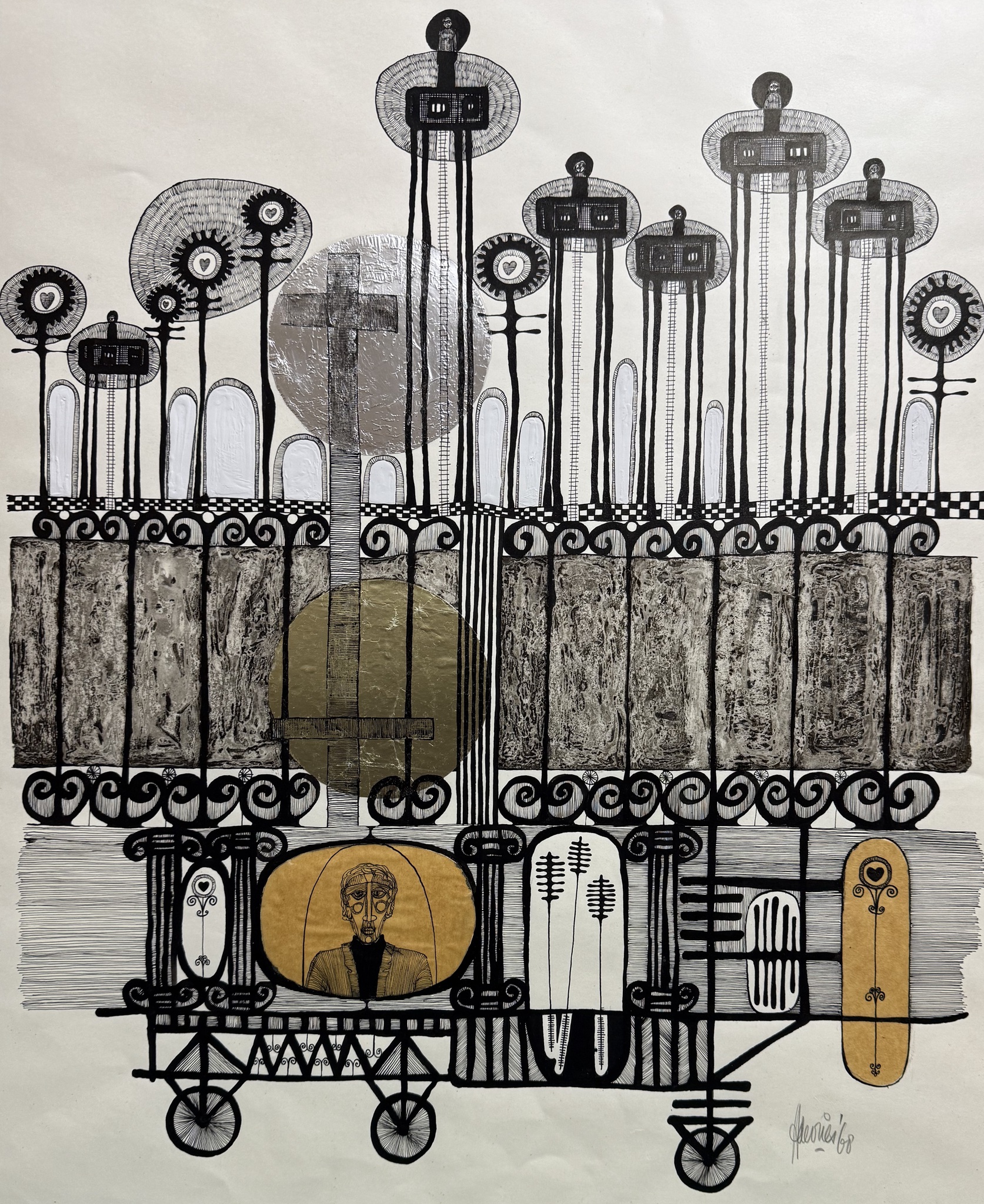 Tekening / collage. Kroontjespen, gepunte stokjes, Oost-Indische inkt. Lijm en O-I-inkt. Overtrekpapier, zilver- en. goudpapier. Witte verf. Op ivoorkarton.