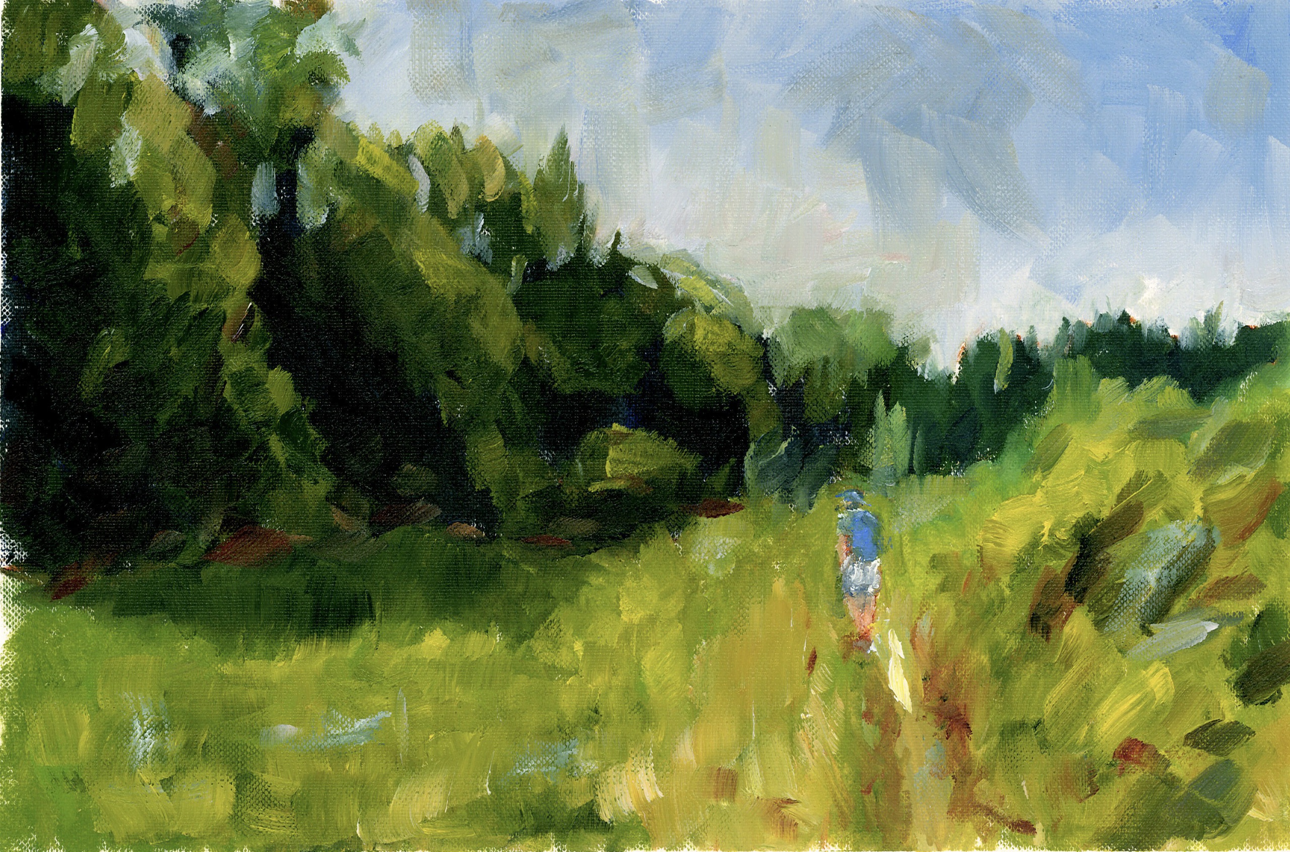 Een kleine figuur beweegt door hoog gras en open ruimte. Het landschap overheerst; menselijke aanwezigheid is ondergeschikt en versterkt het gevoel van schaal en richting. Geïnspireerd door het Limburgs landschap.