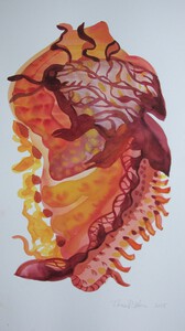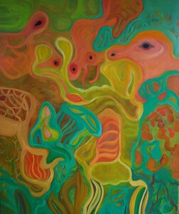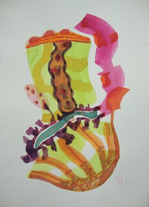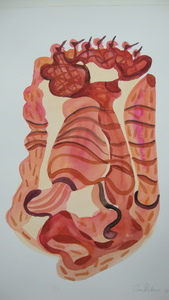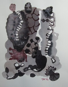 In de abstracte schilderijen en aquarellen worden stucturen en patronen, meestal uit de natuur opnieuw gerangschikt om zo in de essentie versterkt terug te komen.