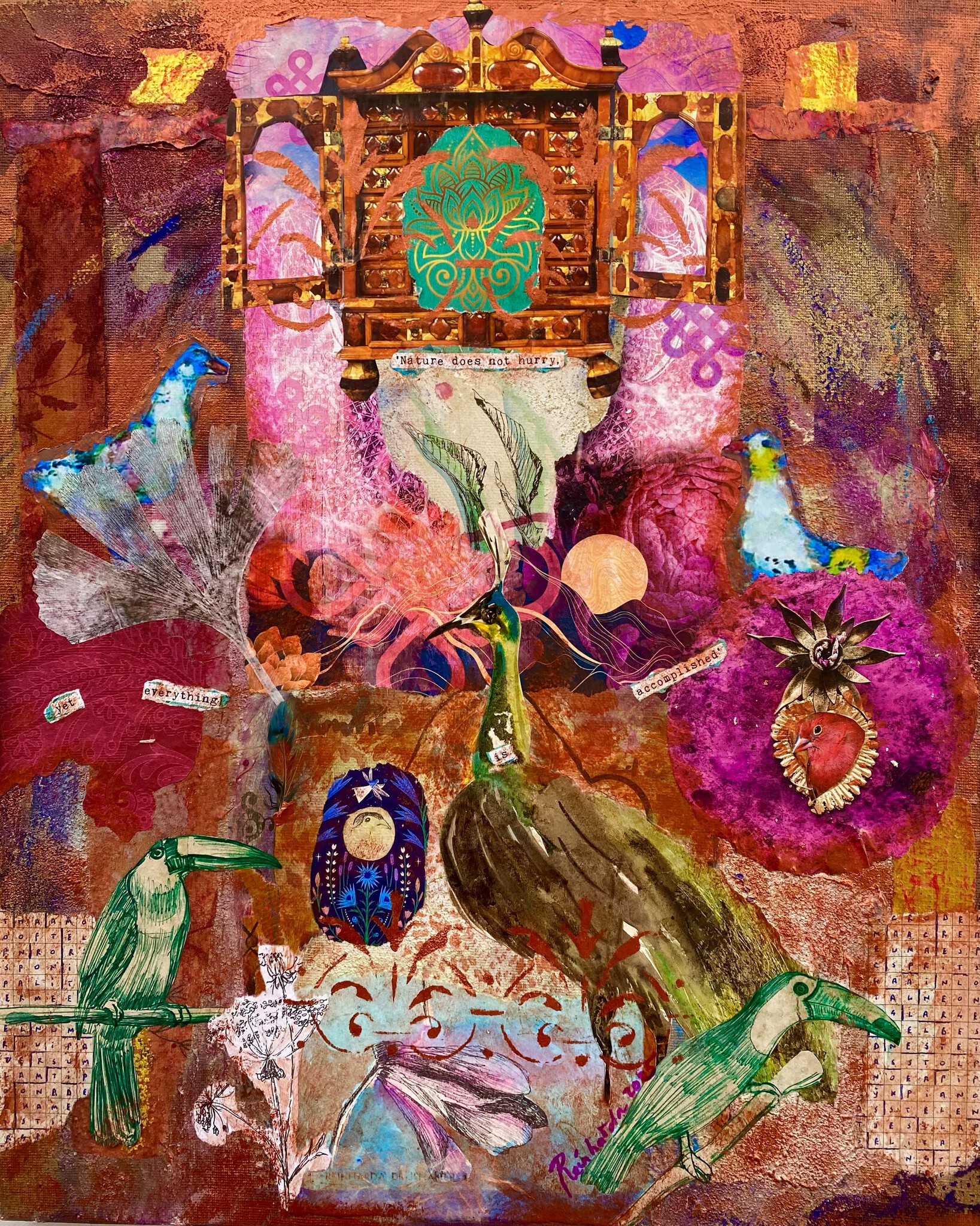 This work reflects life as a quiet passage rather than a destination. Birds move through layered worlds of memory, earth, and sky, guiding the eye toward an inner threshold where opposites meet. Echoing Laozi’s wisdom — “Nature does not hurry, yet everything is accomplished” — the painting speaks of trust in life’s rhythm: nothing is forced, everything arrives.