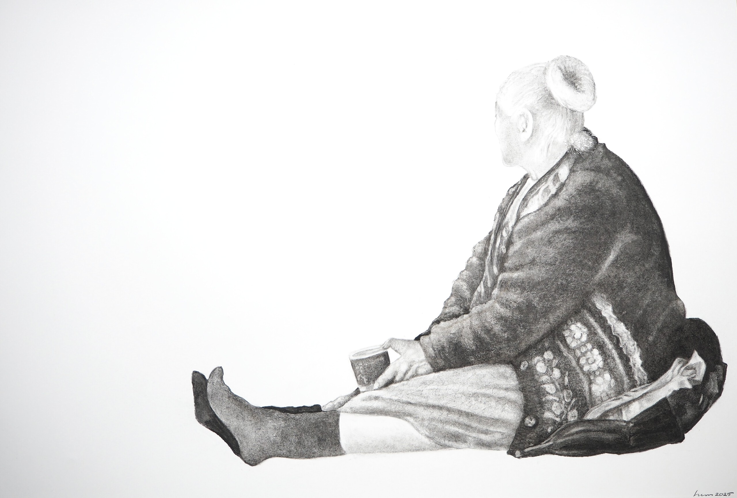 Bedelende oudere vrouw, zittend op straat. Tekening op groot formaat in houtskool.