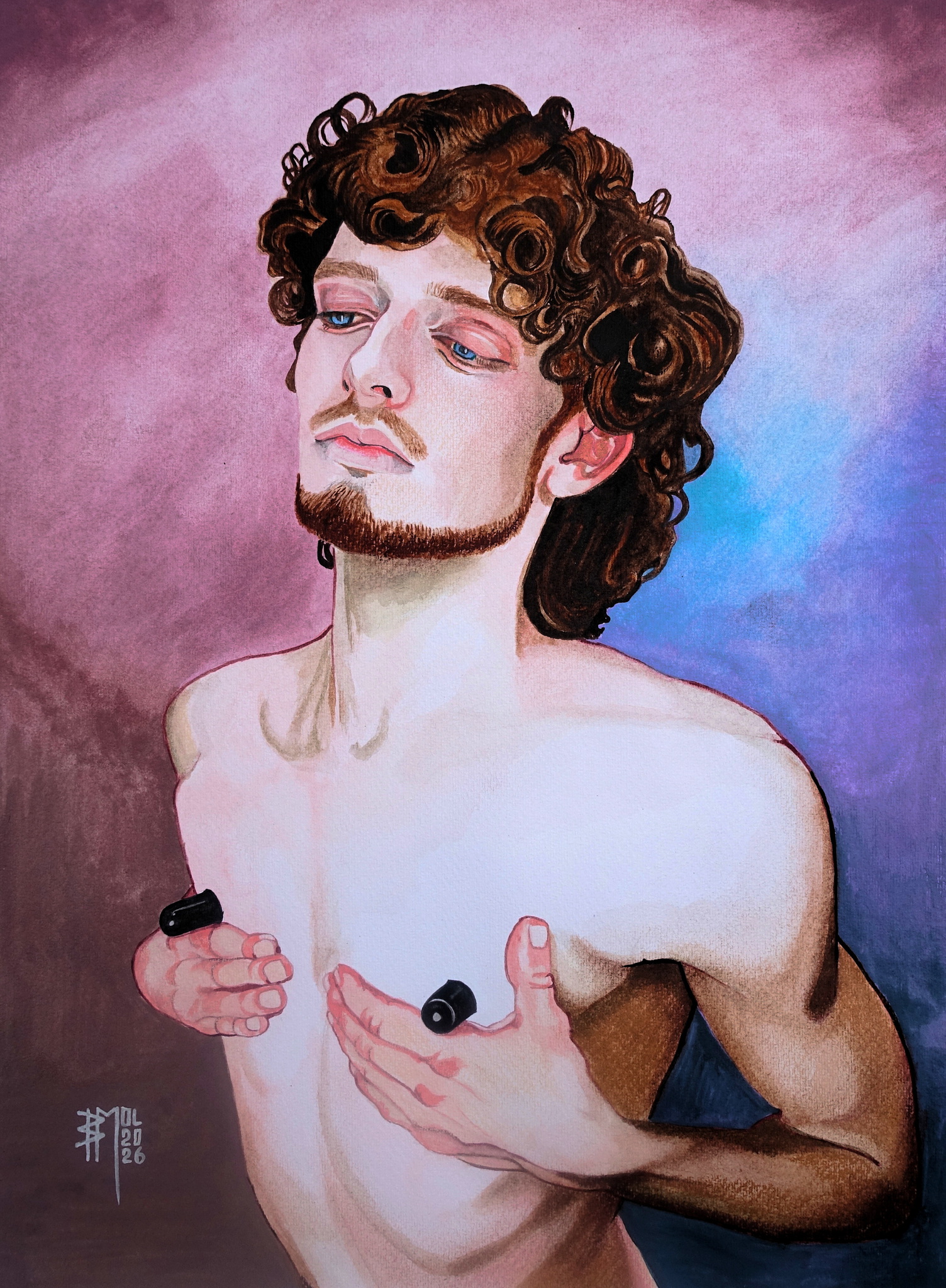 third portrait after the posing session of David F , finished January 1st 2026 in watercolours on cottonpaper 50x60cm