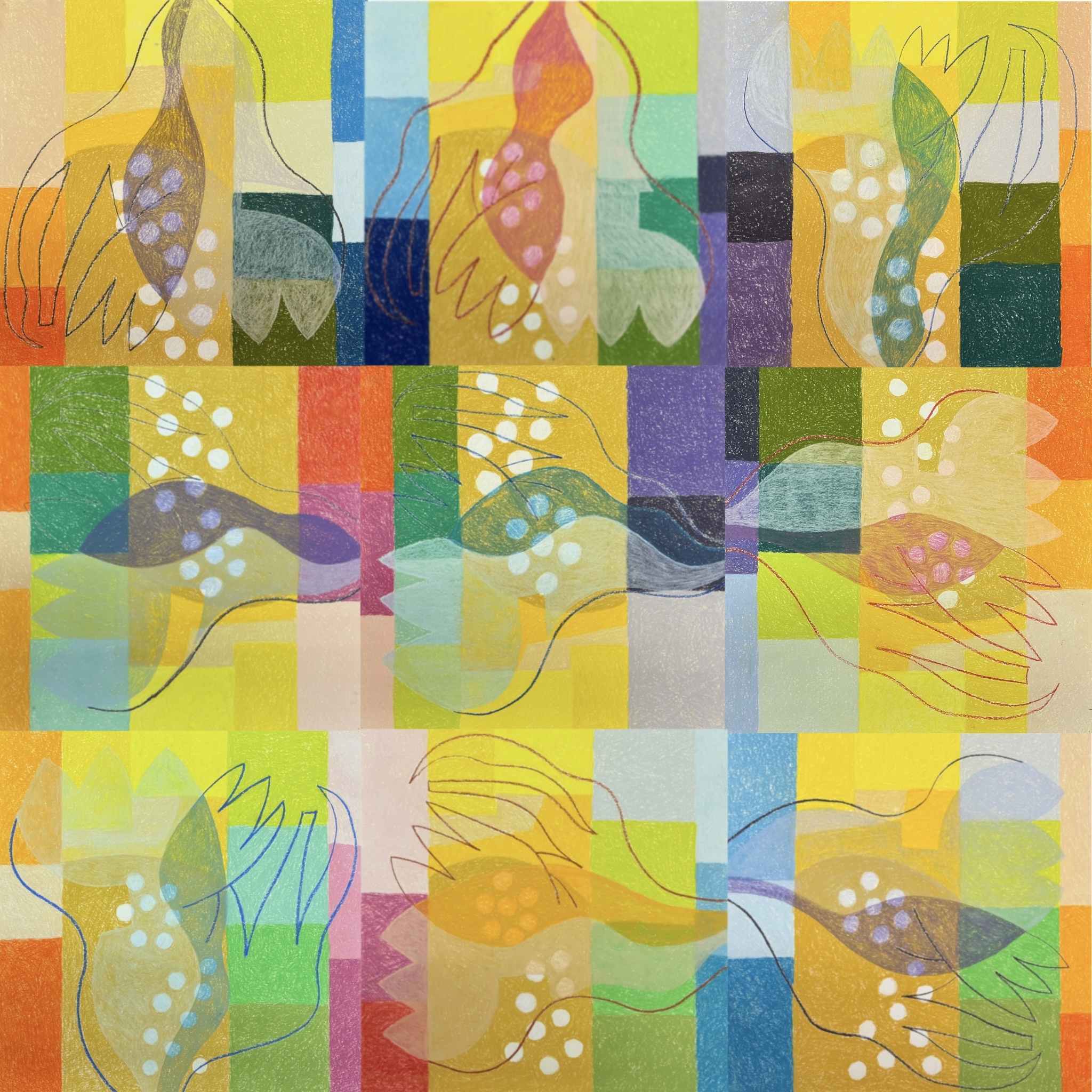 collage bestaand uit 9 pasteltekeningen, atelier Arnhem