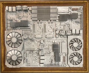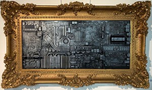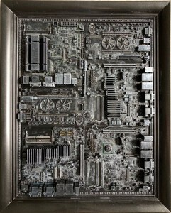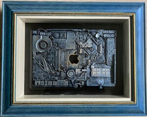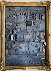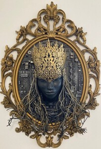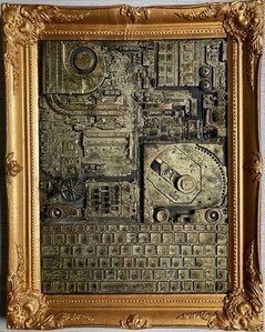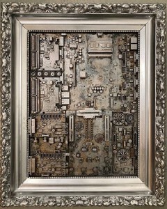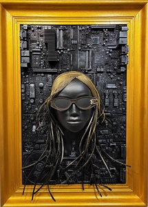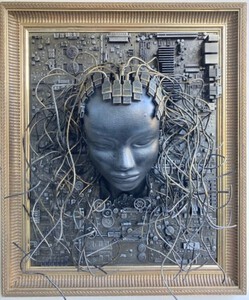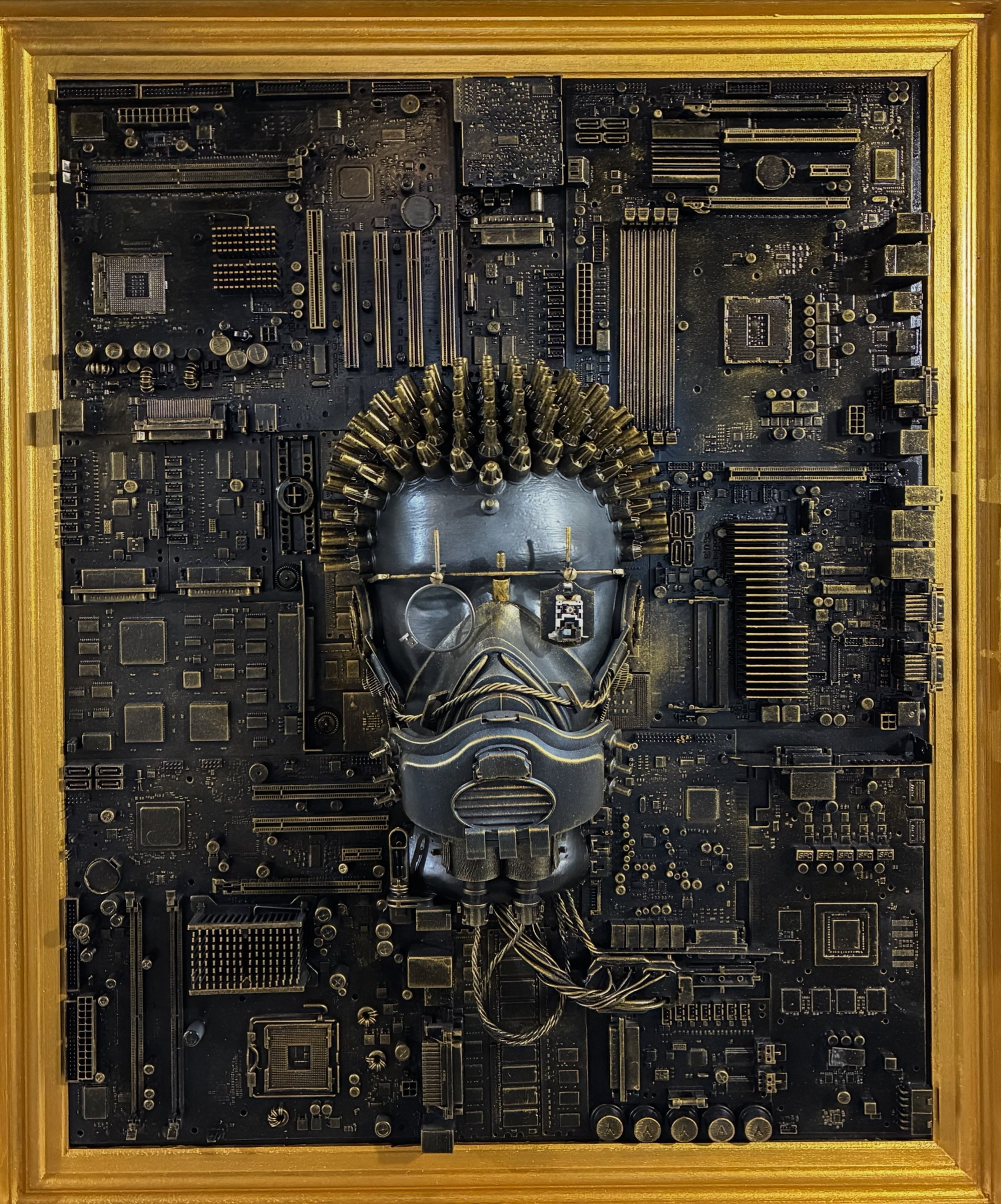Gemaakt van oa. dopjes, bril, spuitmasker, computer en printeronderdelen.