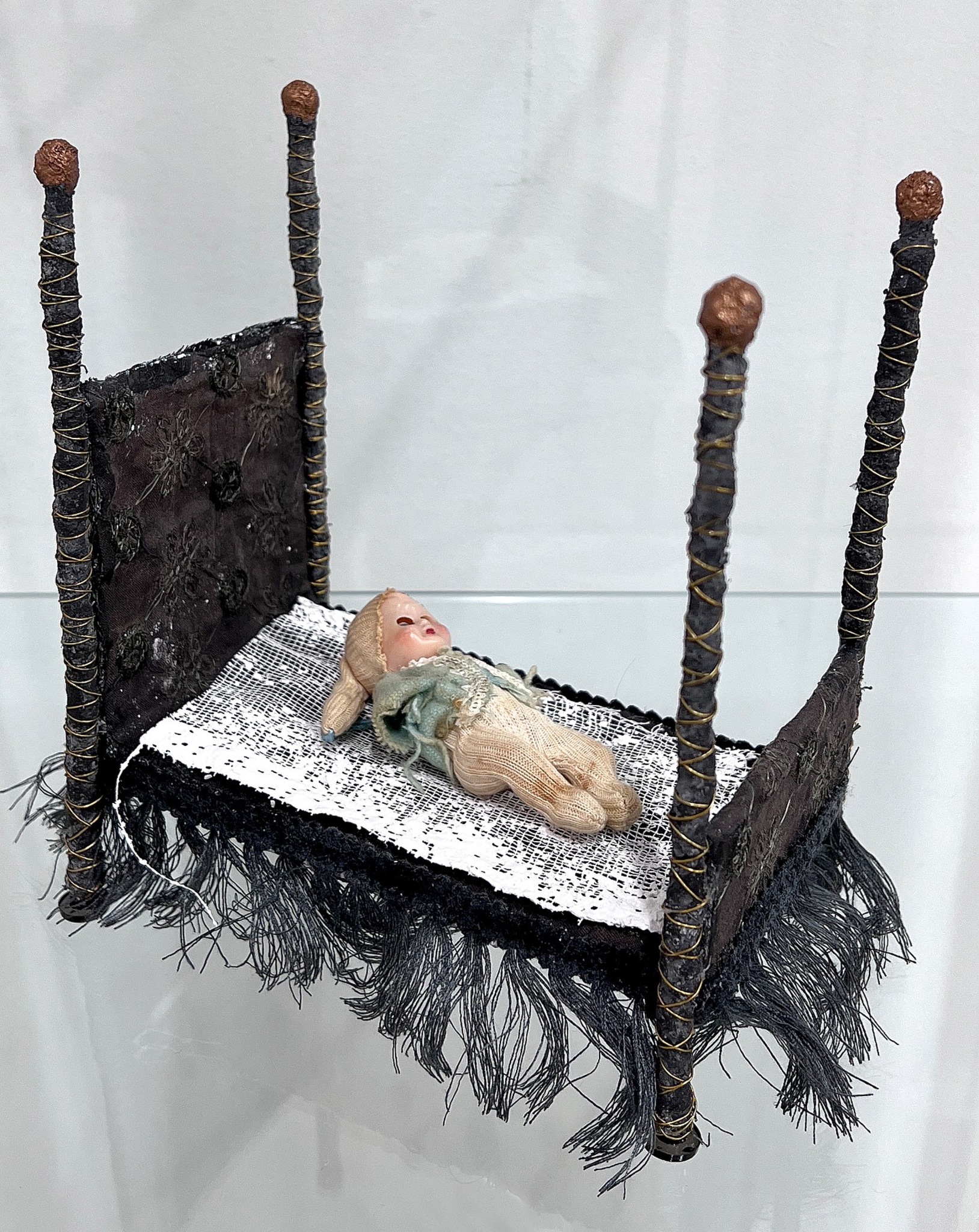 Een tijdje terug zocht ik naar spelden om losse elementen in een werk vast te zetten. Ik rommelde wat in mijn moeders oude naaidoos en rakelde een poppetje op van tussen het garen en gerei. Het poppetje was onbetwistbaar: dood. Wit gezicht, geloken ogen, de laatste kleur nog van de wangen aan het verdwijnen. Ledenmaten afgerukt en vuile kleren die vermoedelijk getuigden van een zware strijd. Ondanks dat ik me op iets anders moest focussen, voelde ik een enorme drang om het kleinood van een laatste rustplaats te voorzien. Van gips en stof timmerde ik een bed. Daar rust zij momenteel.