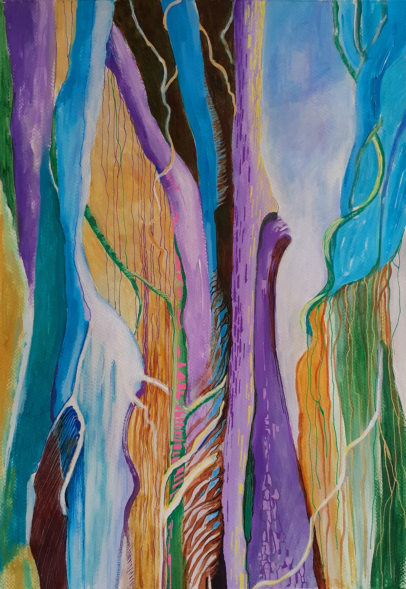 Gemengde schilder-en tekentechnieken. Uitgangspunt is boomstam in las Duenas in Sevilla.