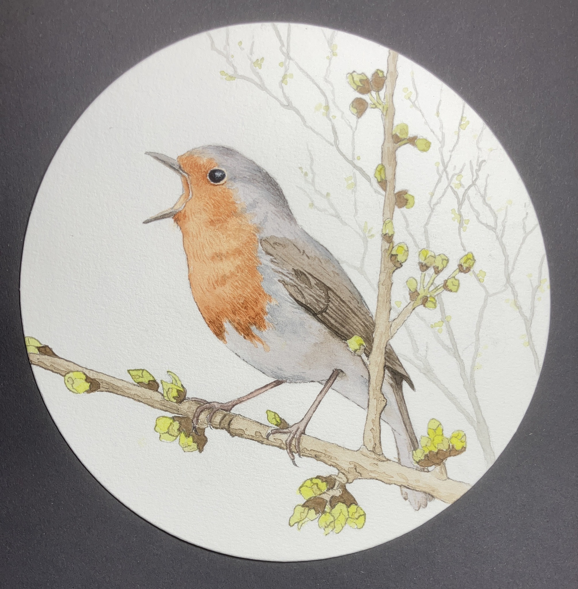 Roodborst op een tak met kersenbloesem. Aquarel en Chinese inkt. Doorsnede 16 cm.