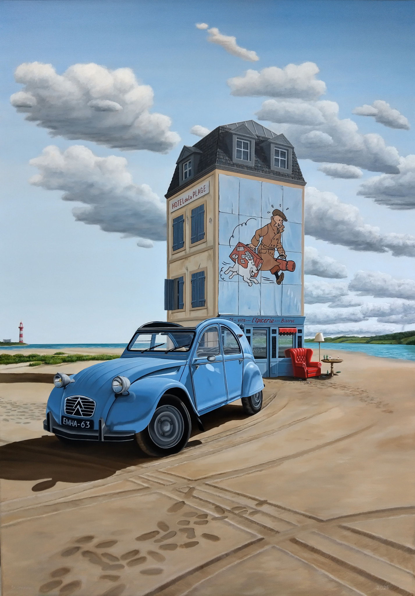 Een blauwe Citroën 2CV, een strandhotel met stripmuurschildering en een woonkamer zonder muren vormen samen een surrealistisch stranddecor. In Mijmeringen van nieuwe avonturen versmelten herinnering en verbeelding tot een scène die zowel vertrouwd als vervreemdend aanvoelt. Alles lijkt stil te staan, terwijl de gedachte aan een nieuw avontuur zachtjes tot leven te komen.