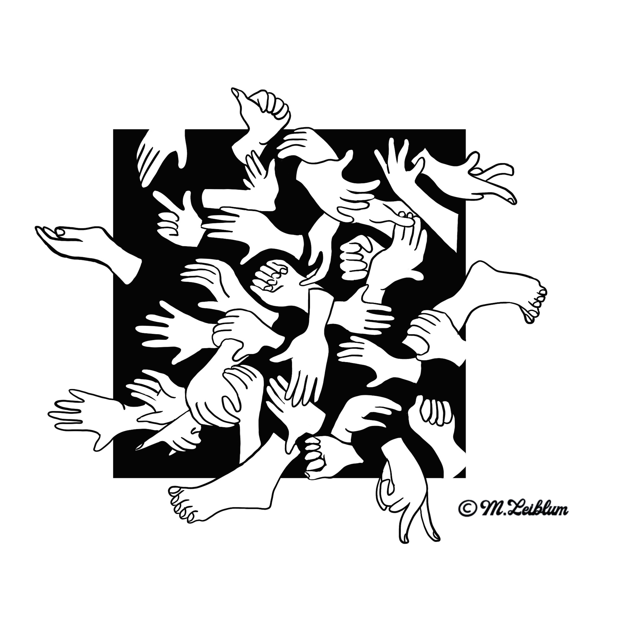 In het kader van inktober, zwart wit illustratie van handen en voeten onderweg in een kader