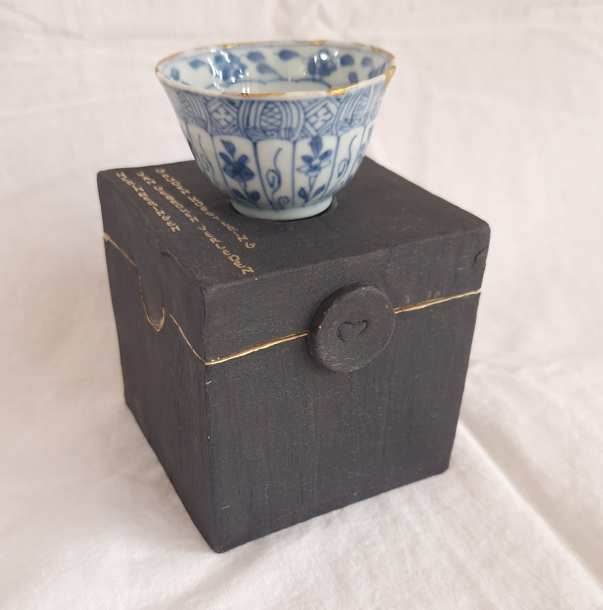 Een eeuwenoud Japans kommetje, hersteld met goud volgens de traditie van kintsugi. Daaromheen een keramisch pronkdoosje, speciaal ontworpen om het kommetje te beschermen én te tonen. Het kommetje kan veilig in het doosje worden opgeborgen, maar ook bovenop worden geplaatst, waar het doosje fungeert als een sokkel en het geheel tot een verstild object maakt.