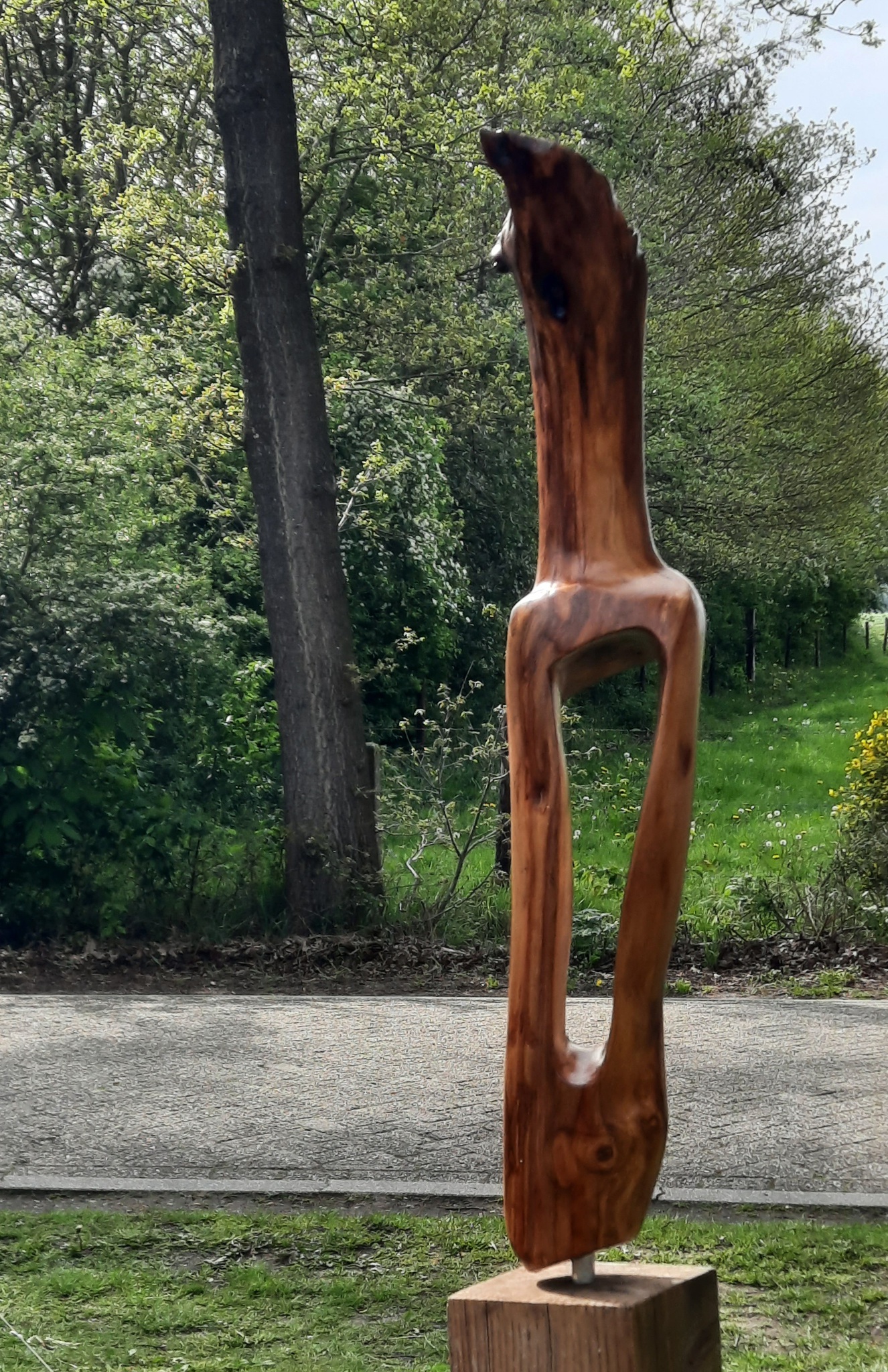 Het natuurlijke levendige van hout is voor mij de uitdaging. Het liefst werk ik "en taille directe". Zoeken in het hout. Hoe om te gaan met de kwasten? Hoe mee te gaan met de jaarringen? Opgenomen worden in die spelingen van de natuur. Dan een harmonieuze intrigerende sculptuur te maken. Met alles wat er door de natuur al in gebakken was.